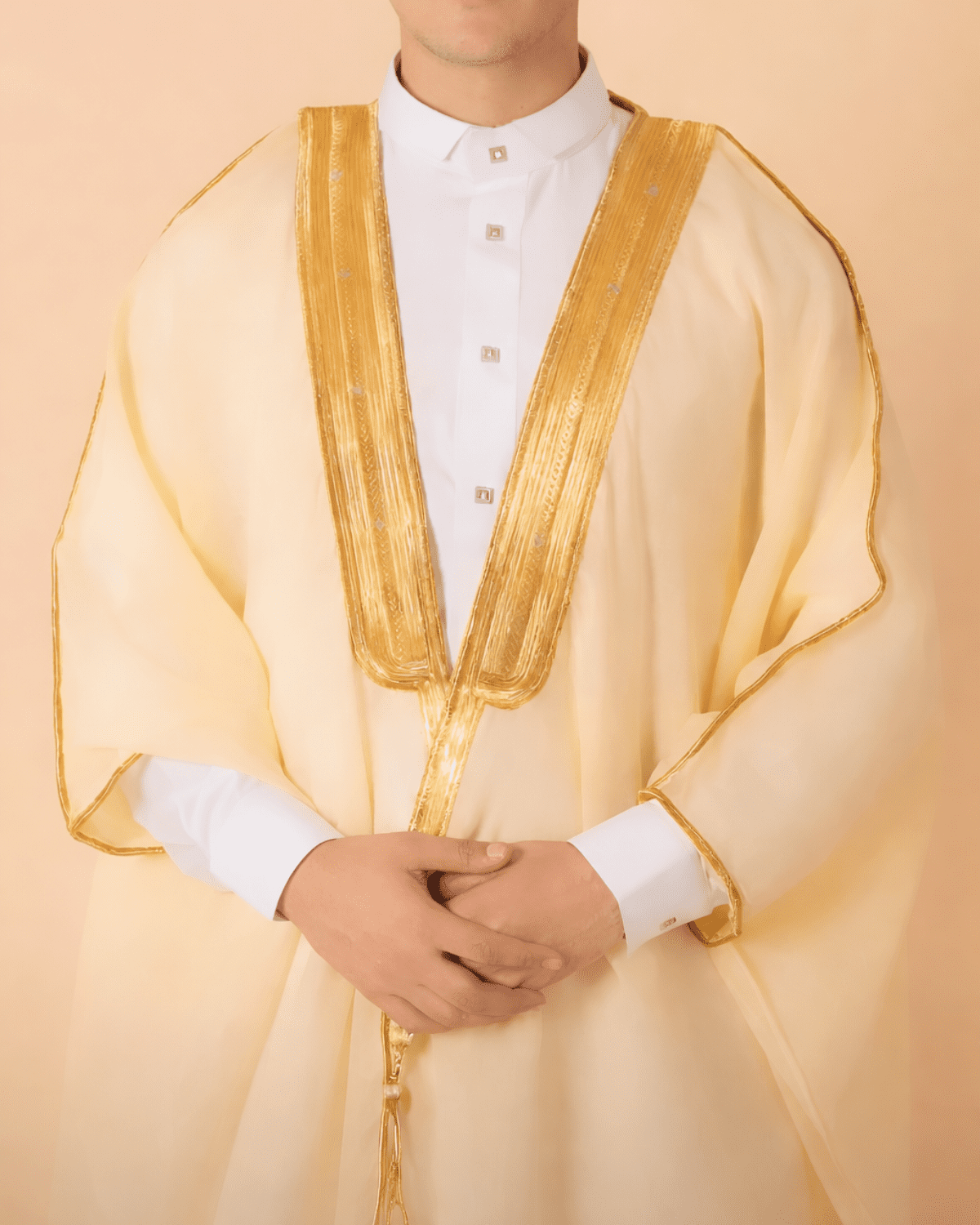 Cream Arabic Bisht for Men with Gold Zari Border Embroidery – Premium Lightweight Open-Front Cloak