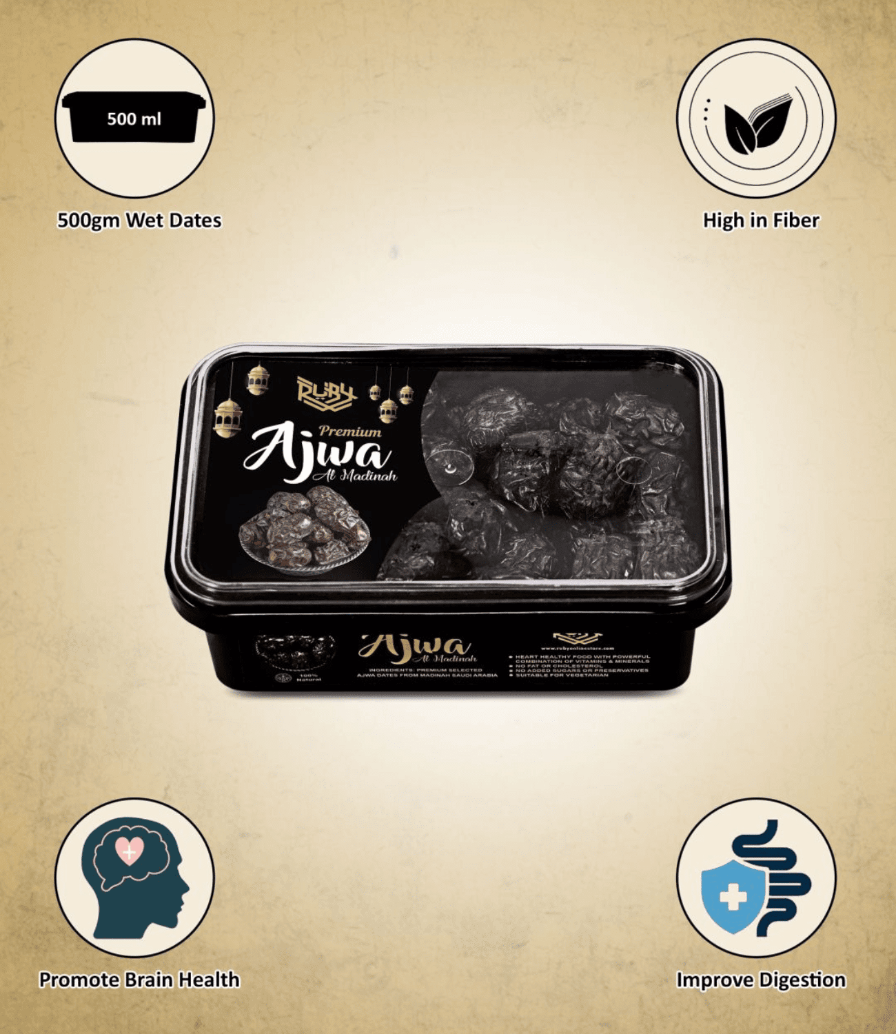 These premium Ajwa Al Madinah dates are carefully selected from Madinah, Saudi Arabia, known for their soft texture, deep dark color, and naturally sweet flavor. Packed fresh in a hygienic sealed container, they contain no added sugar or preservatives and are suitable for daily consumption and gifting.
