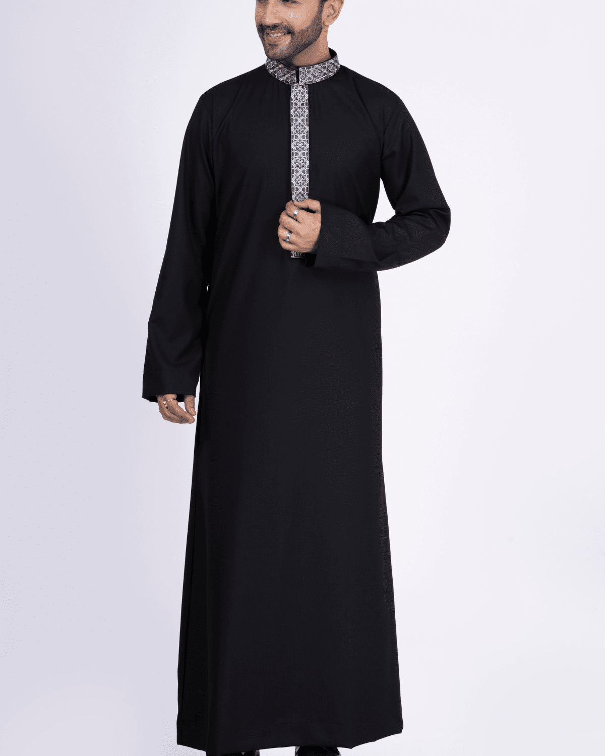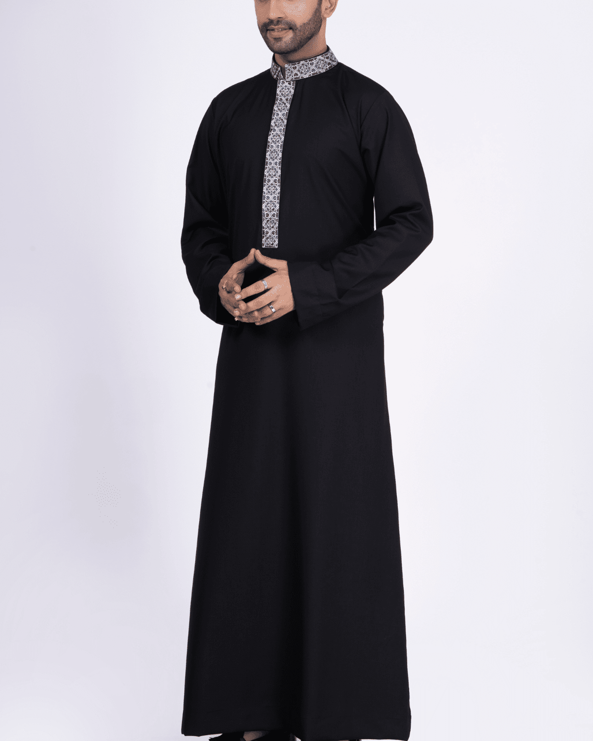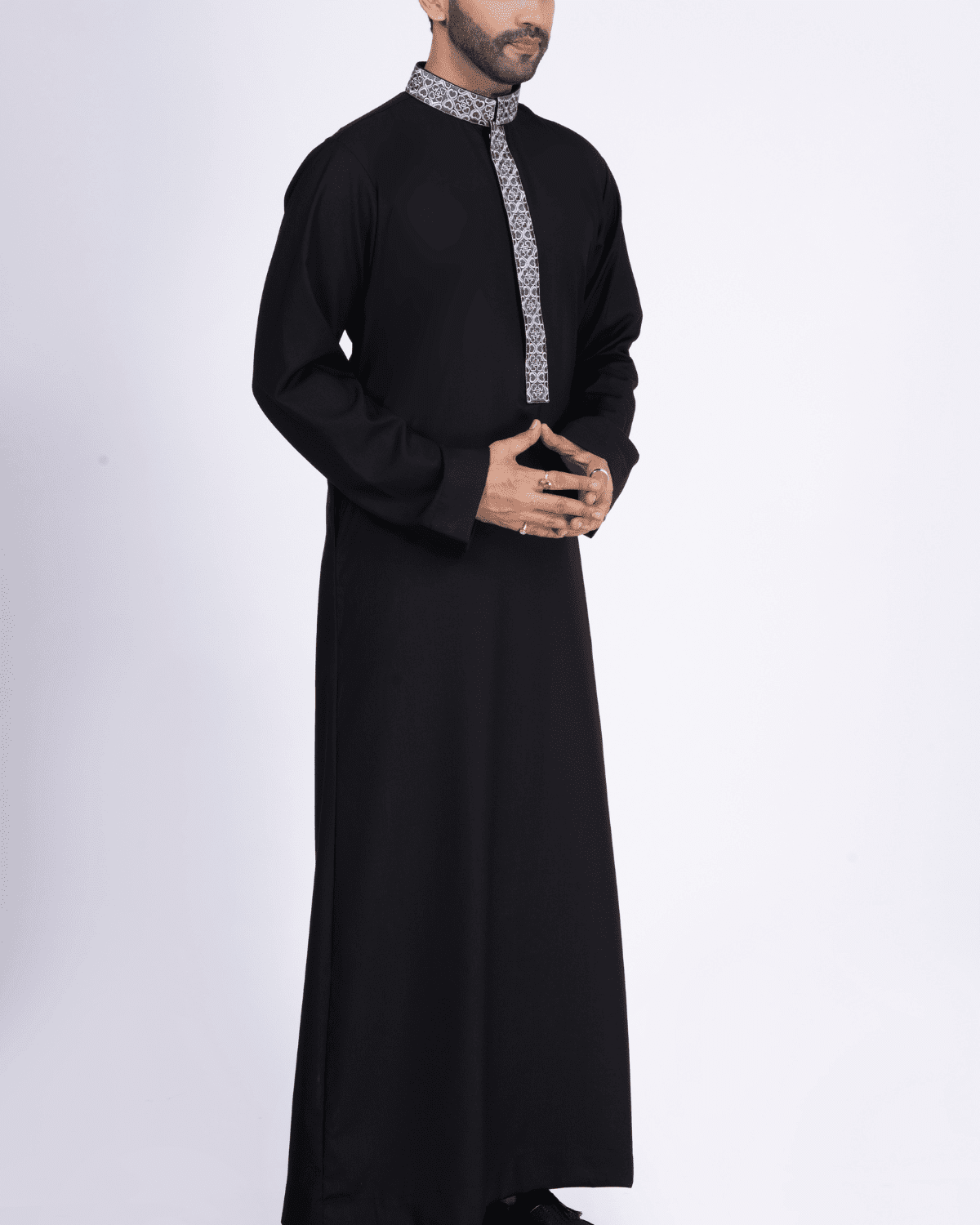 This classic black thobe is elevated with a finely detailed grey geometric embroidery strip running along the front placket for a bold yet elegant look. Paired with a fully embroidered band collar and a clean plain body, it is ideal for prayers, Eid, and formal Islamic occasions.