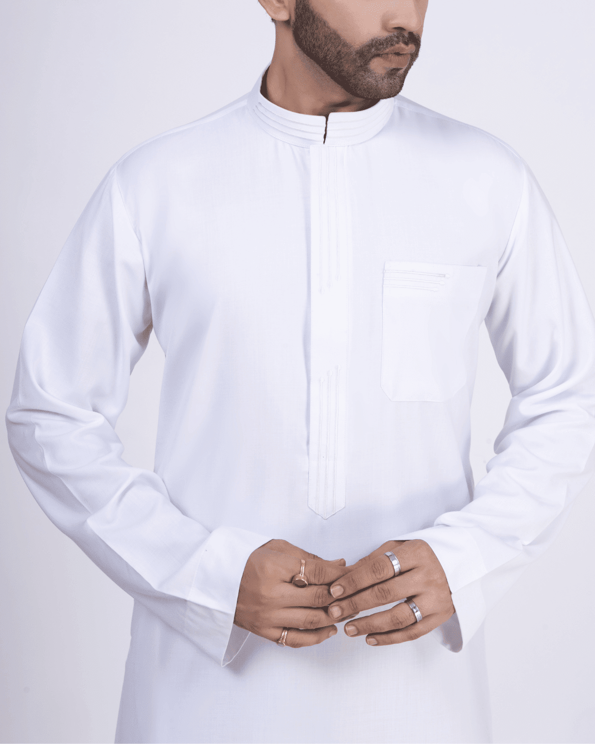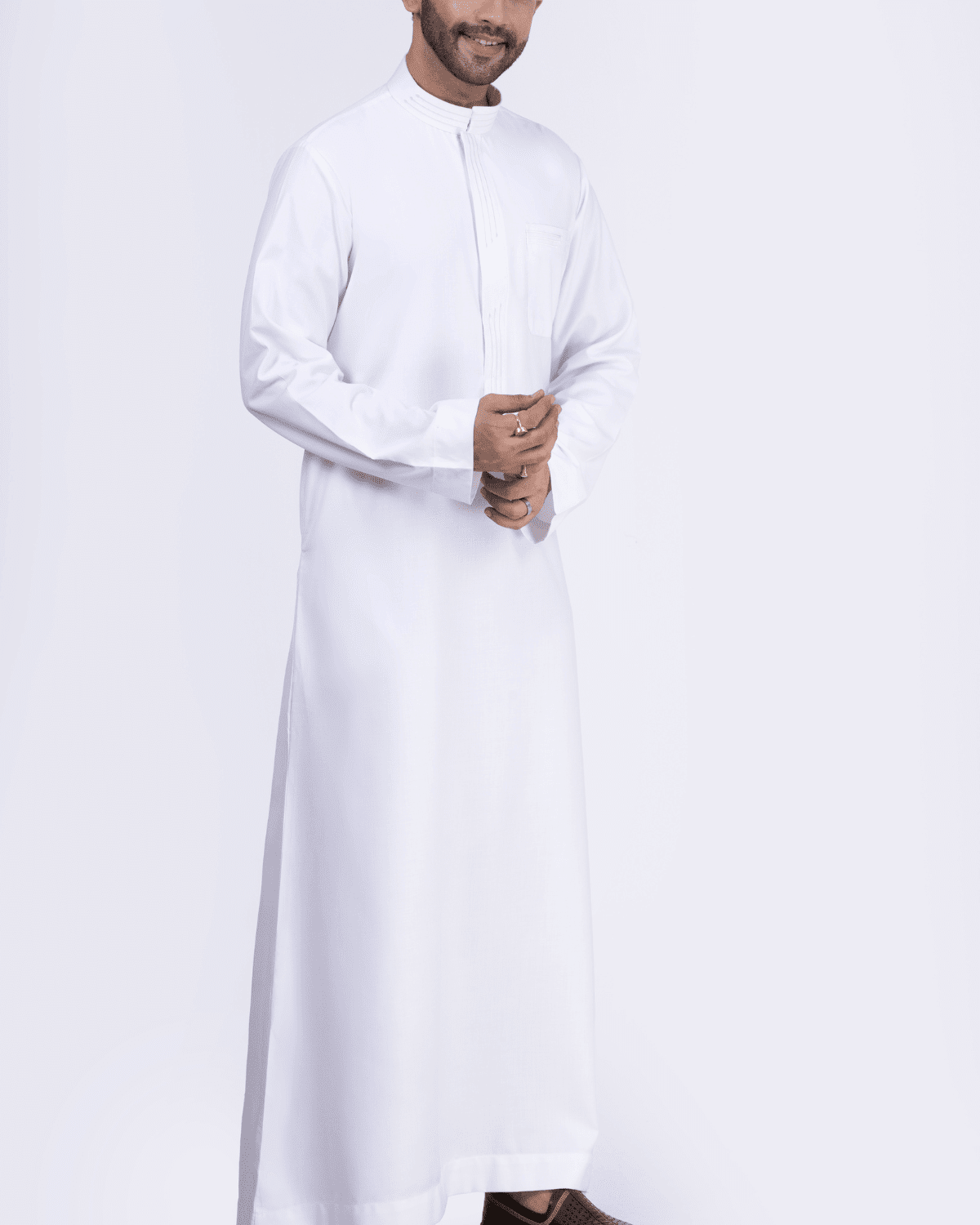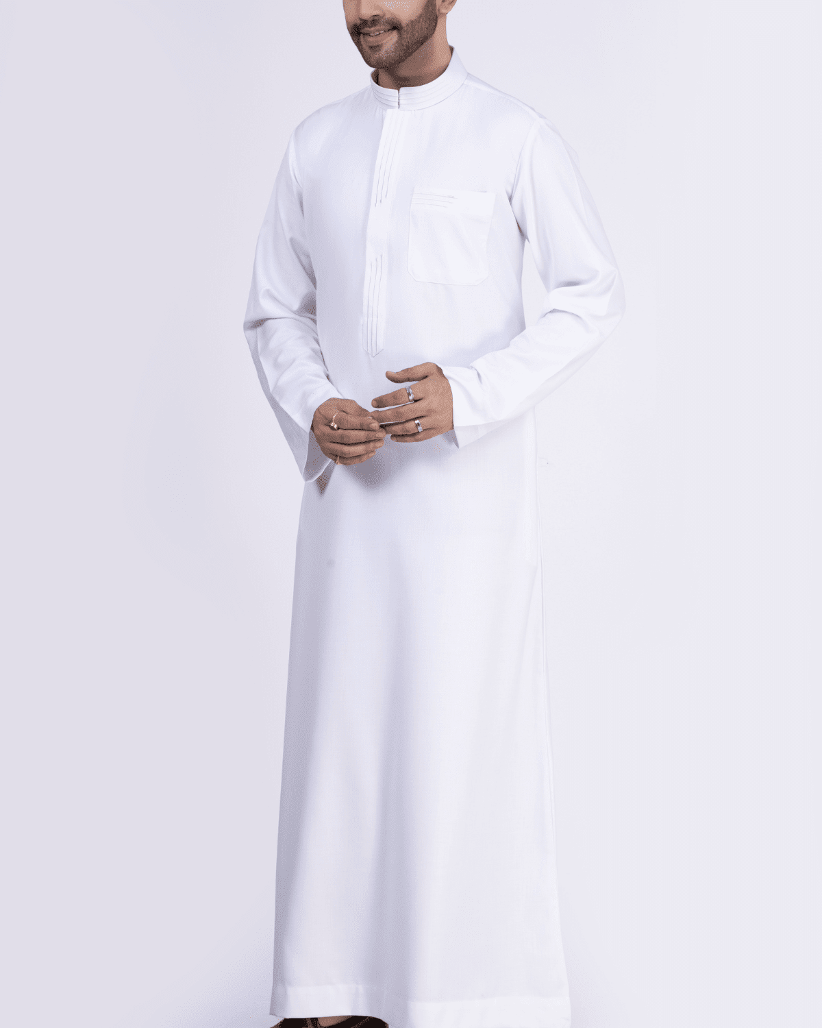 This classic white thobe is crafted with a smooth plain finish, highlighted by a neatly stitched vertical placket and traditional band collar.