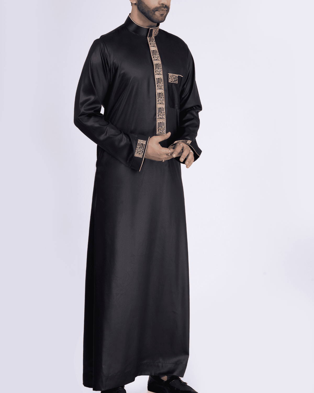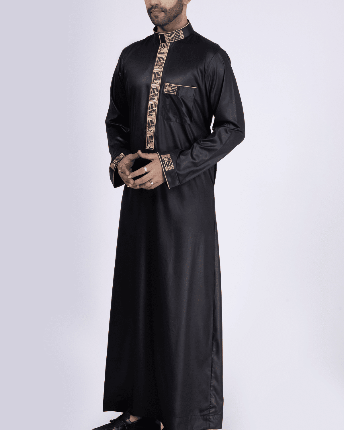 Finished with an embroidered band collar, cuff accents, and pocket detailing, it is ideal for Eid, prayers, and formal Islamic occasions.