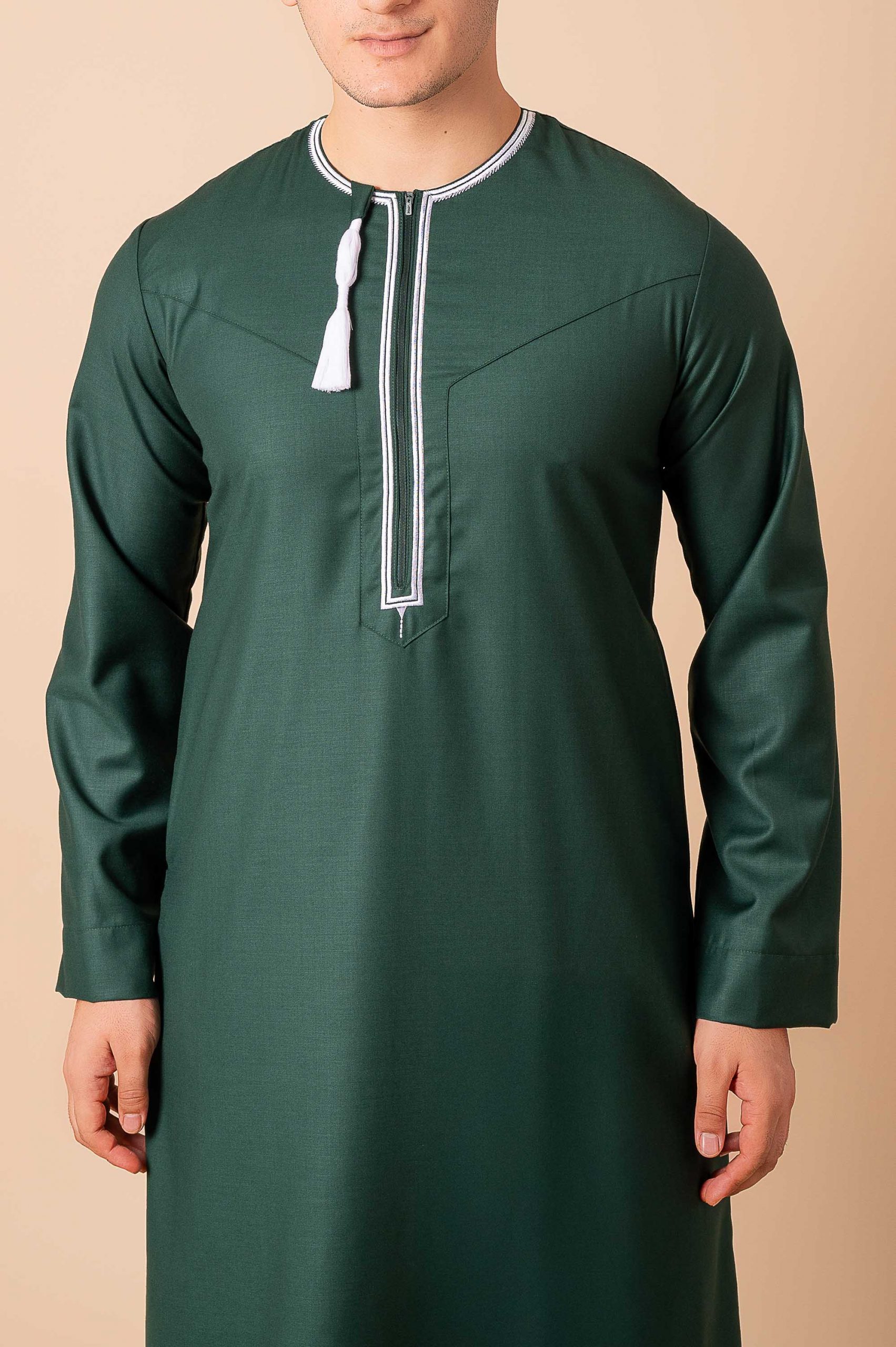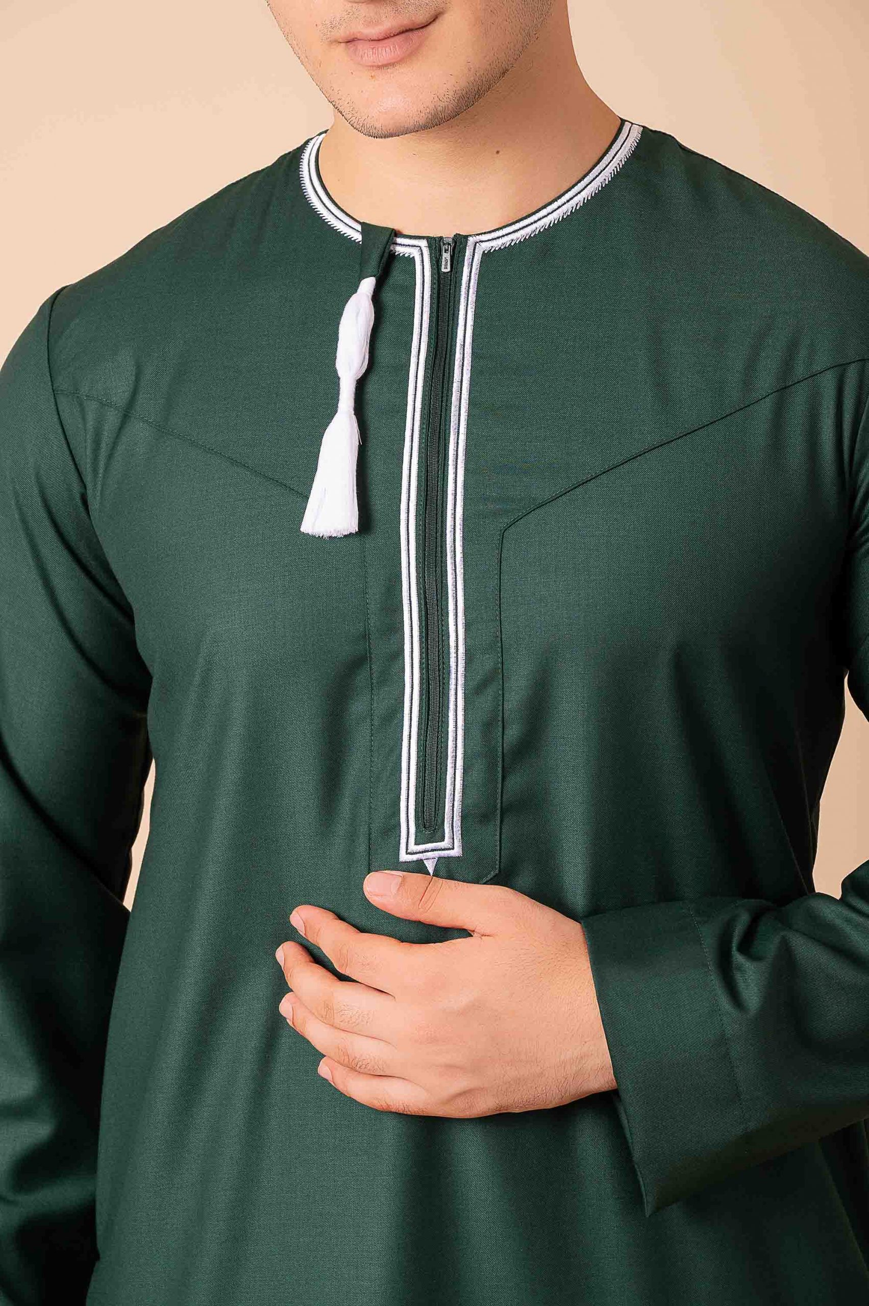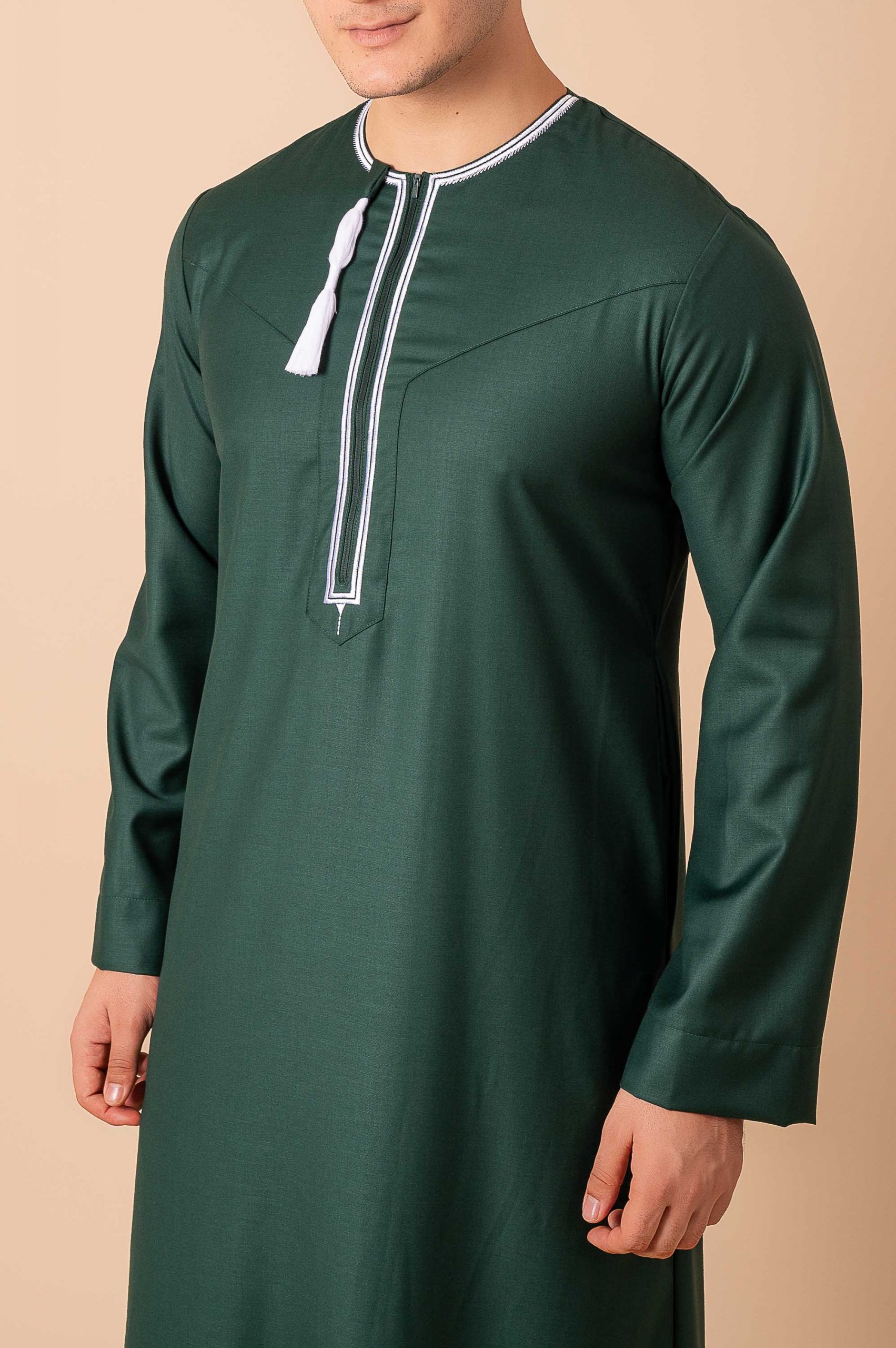 Classic dark green Omani thobe featuring elegant white geometric embroidery and traditional tassel detailing.