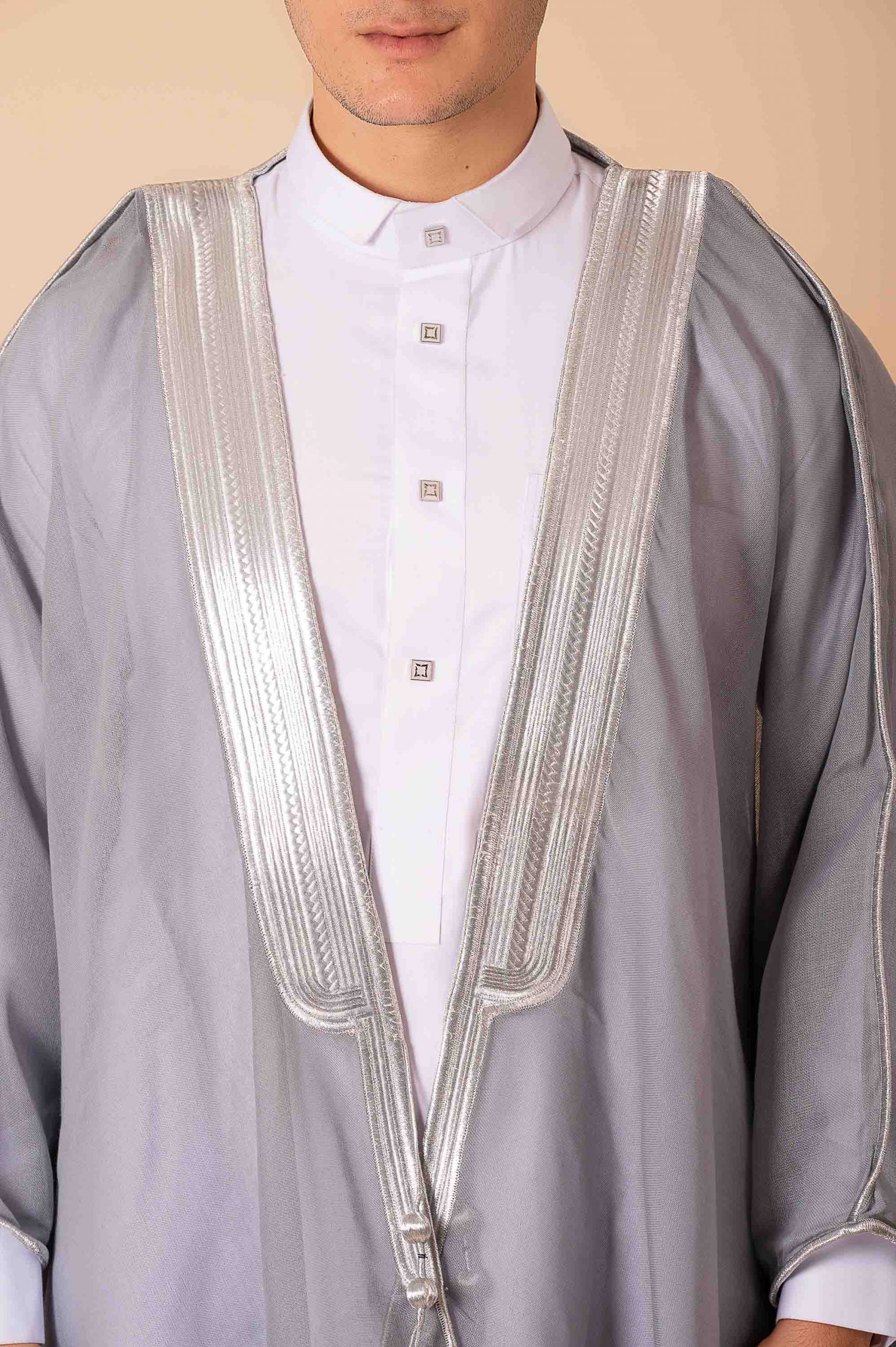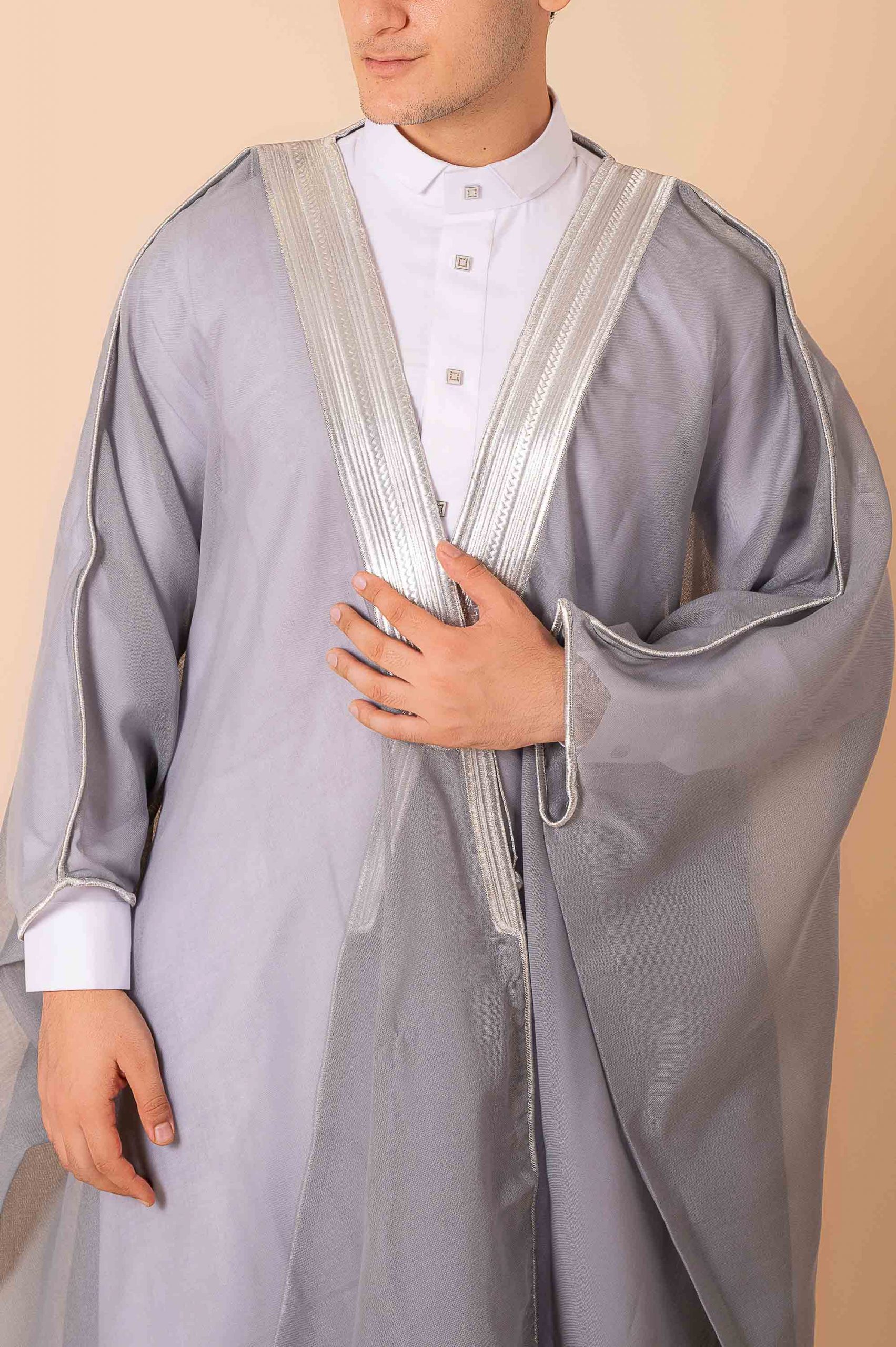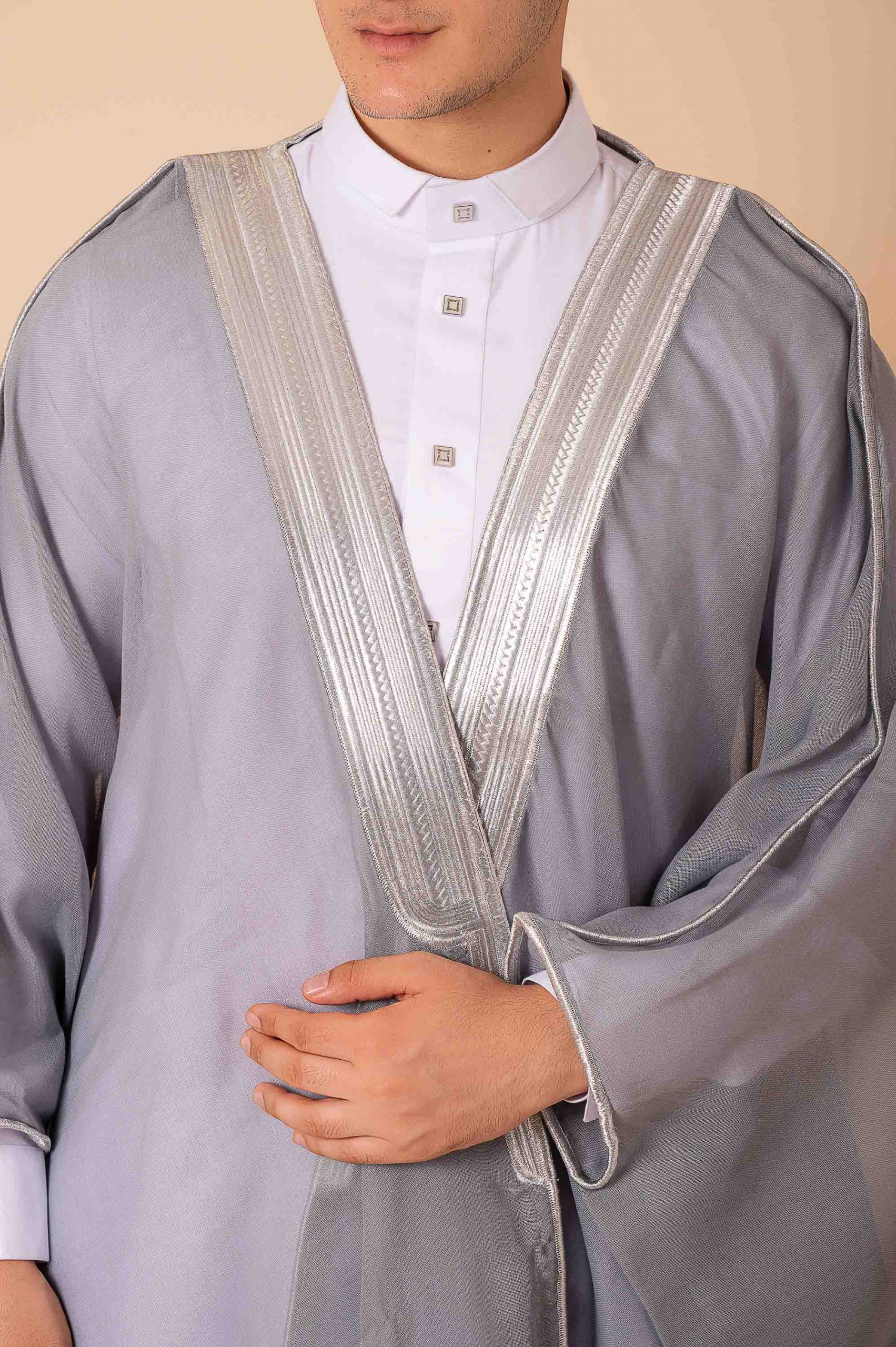 This grey Arabic bisht is crafted from lightweight flowing fabric and finished with classic silver zari (tilla) embroidery along the front opening and neckline for a refined traditional look.