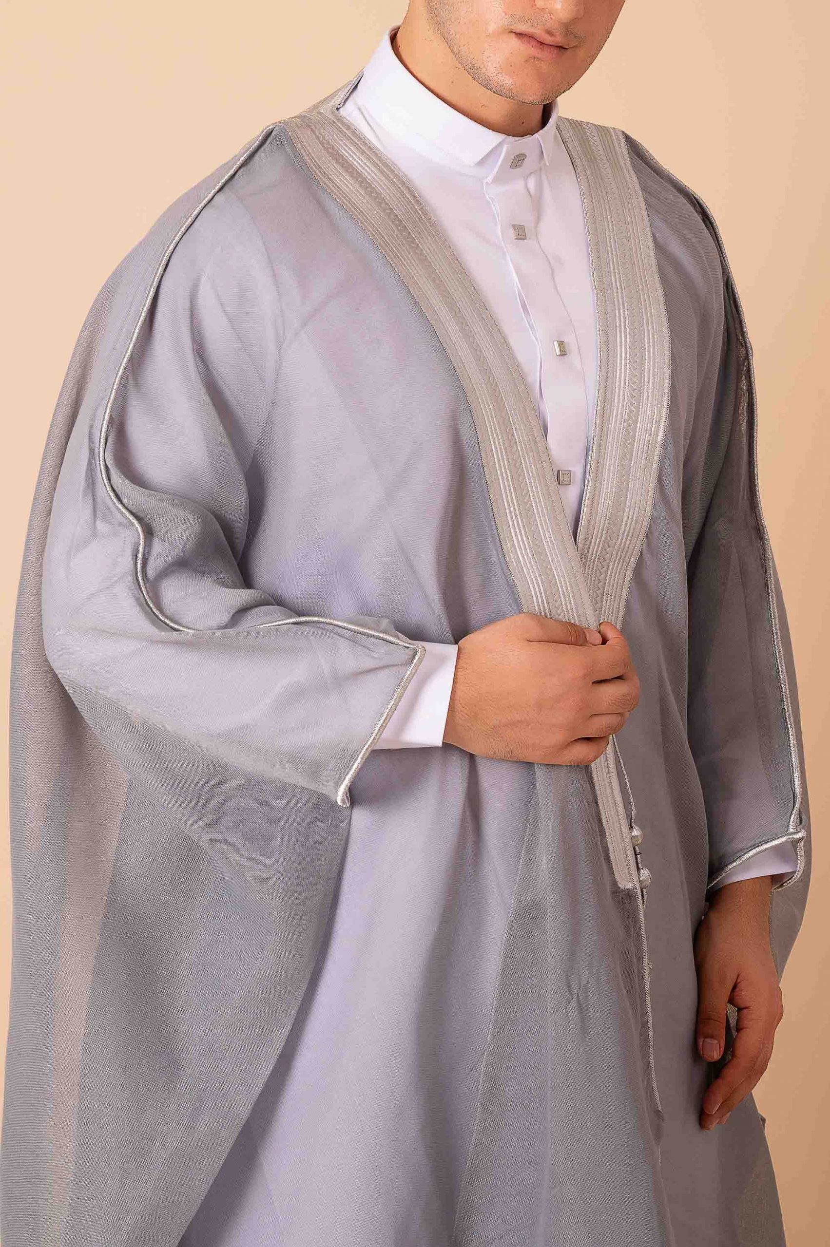 Elegant grey Arabic bisht featuring traditional silver zari edge embroidery for formal and ceremonial wear.