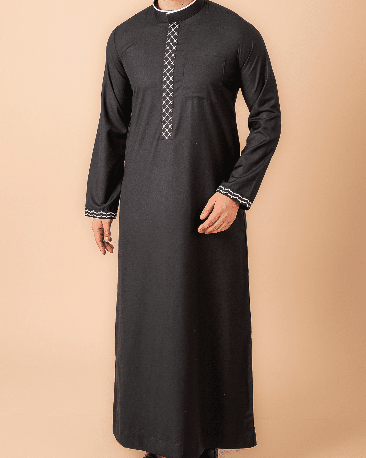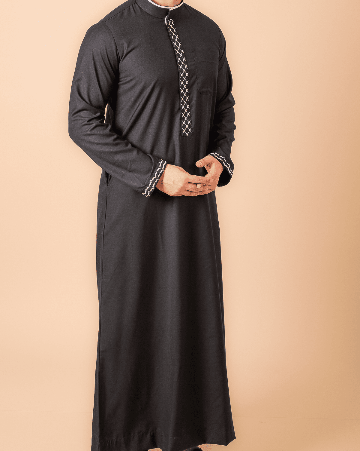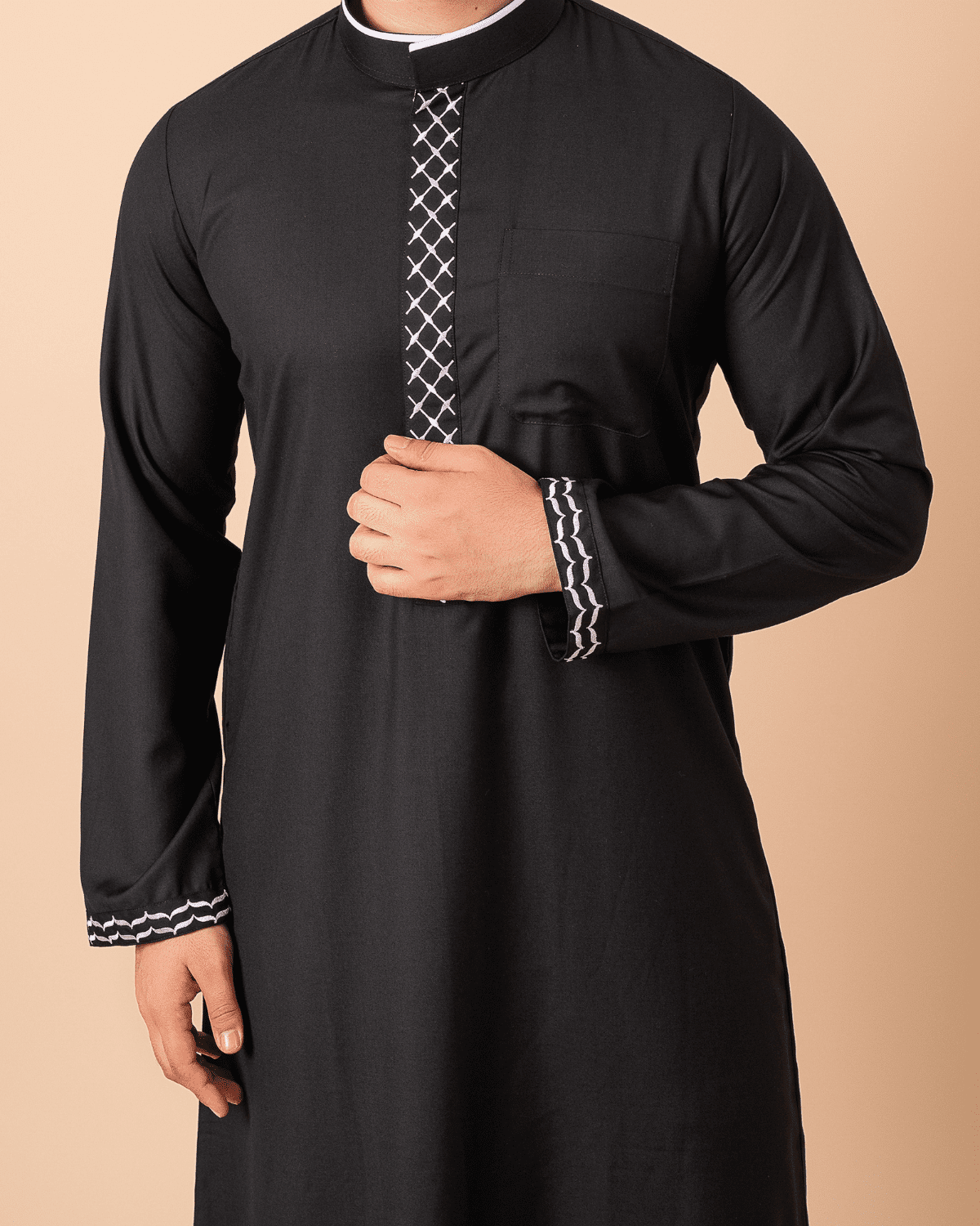 Jet Black Men’s Thobe with White Geometric Lattice Embroidered Placket & Cuff Borders