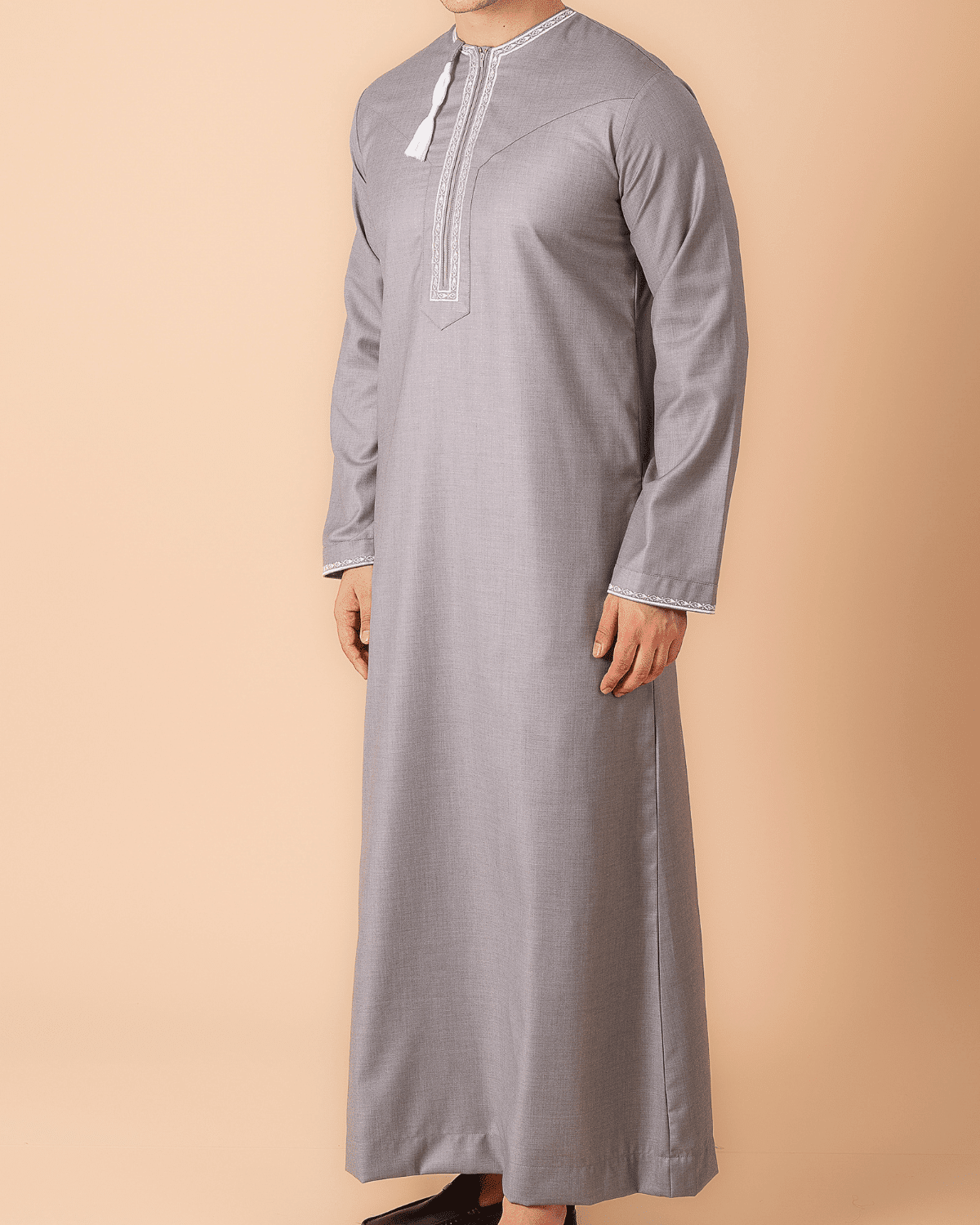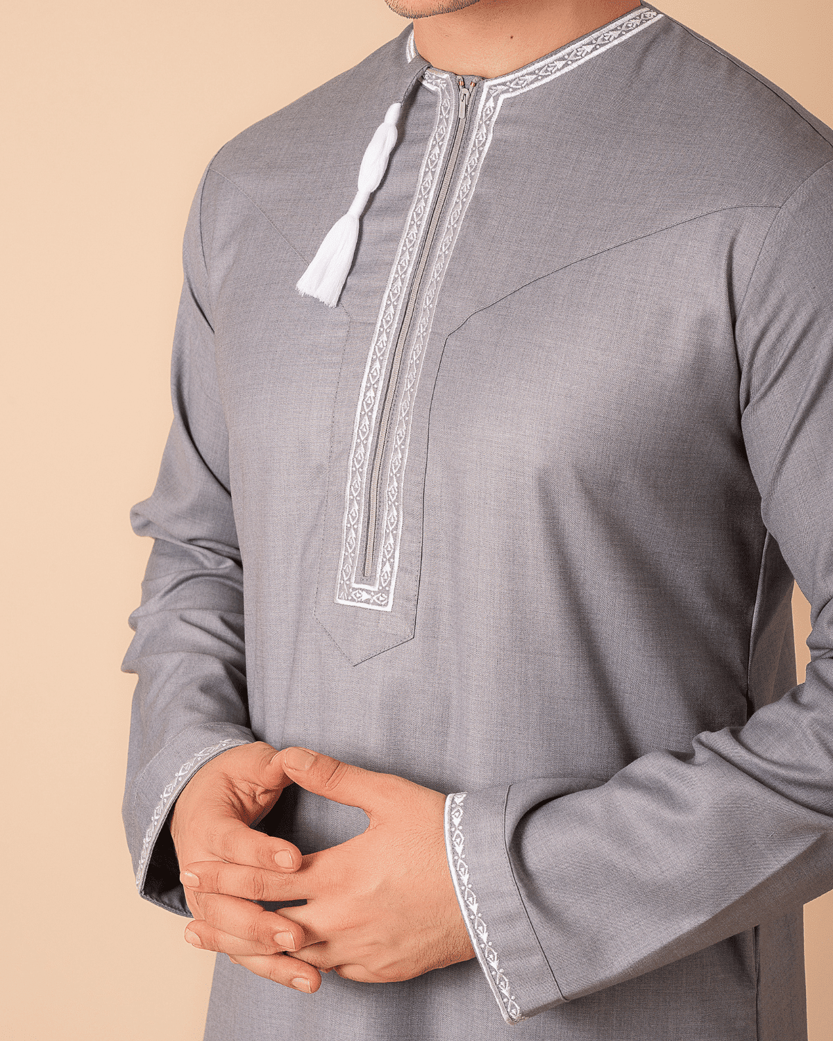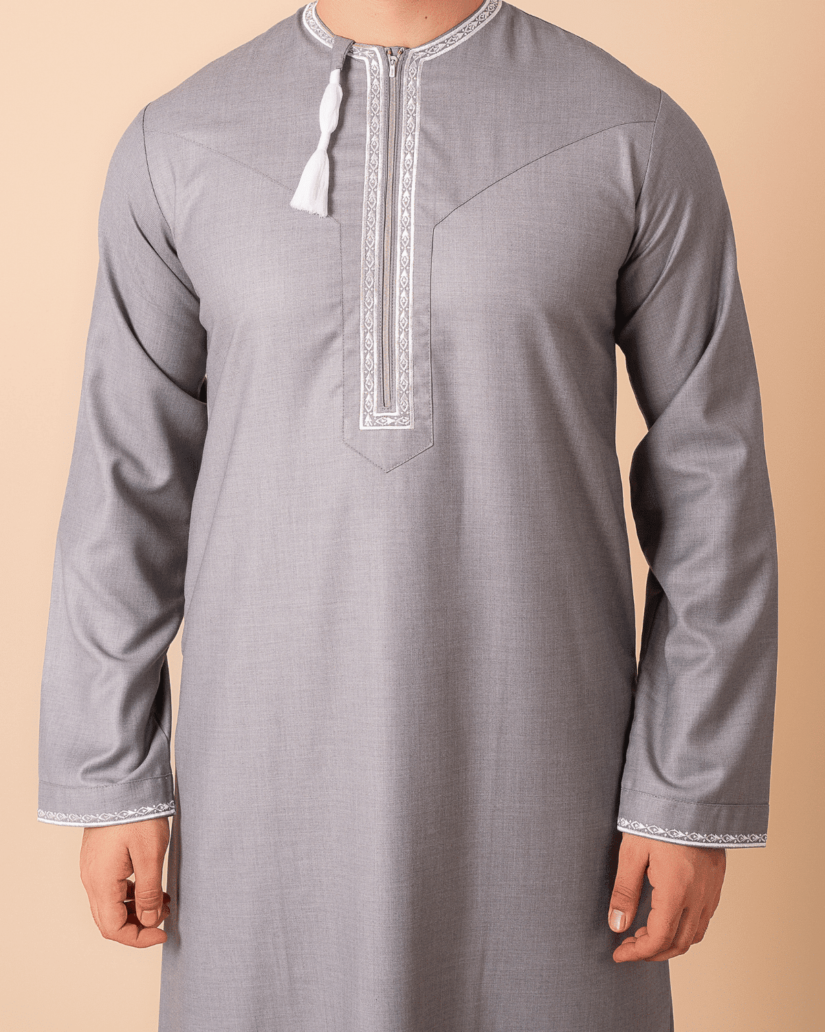 Classic light grey Omani thobe featuring traditional white embroidery and signature tassel detailing.