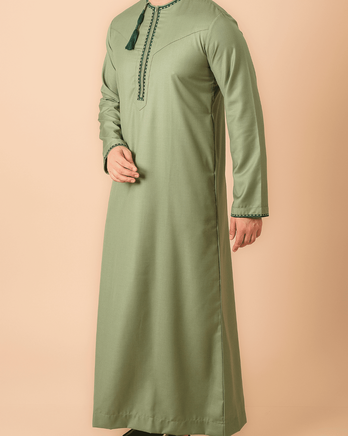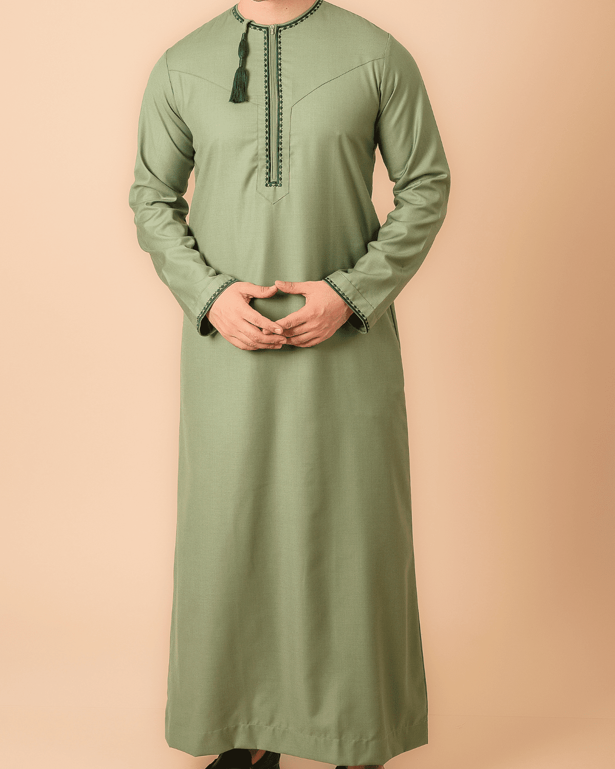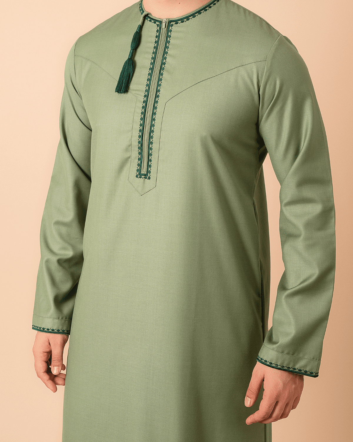 Elegant light olive green Omani thobe featuring refined dark green geometric embroidery and traditional tassel detailing.