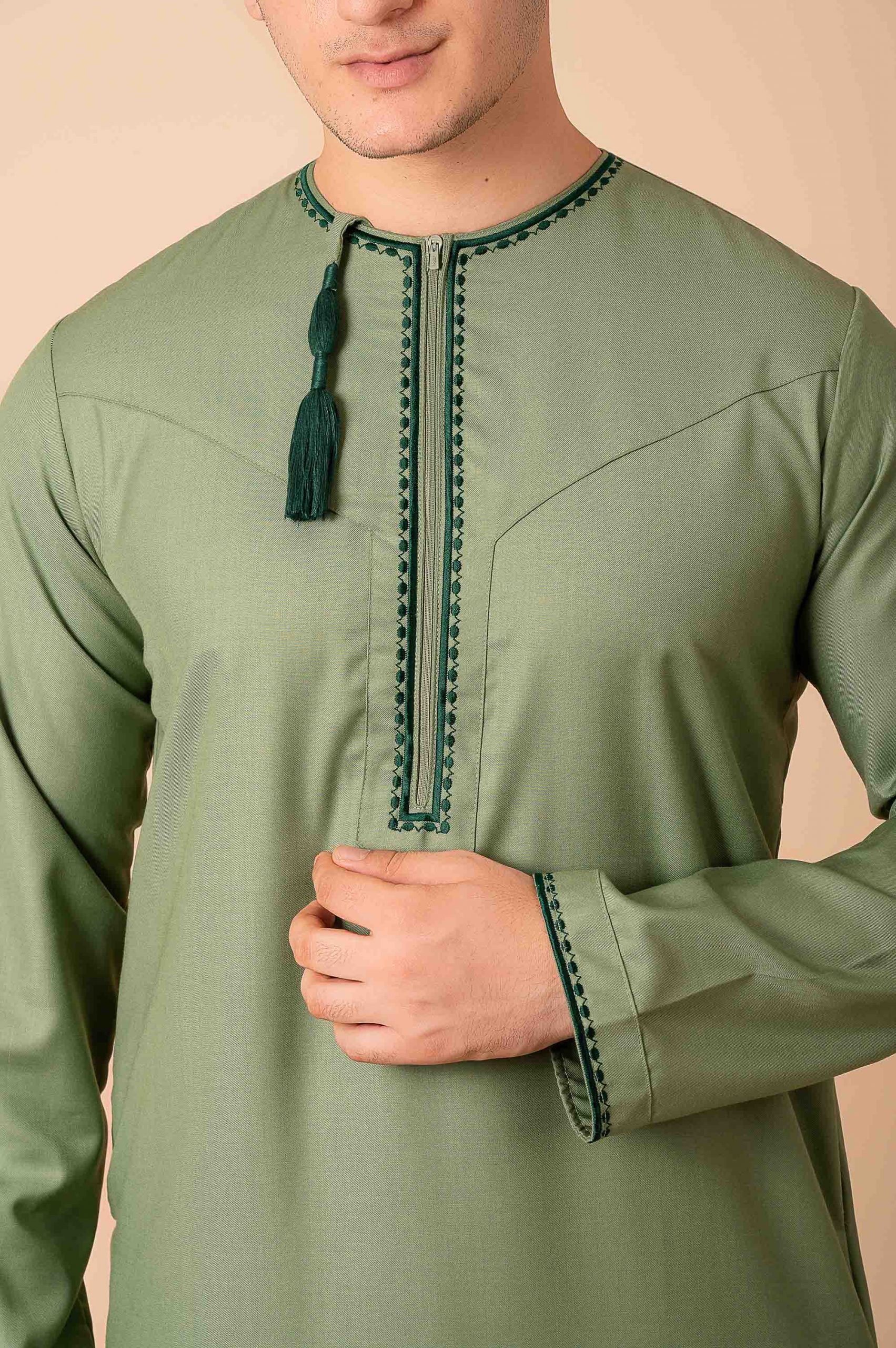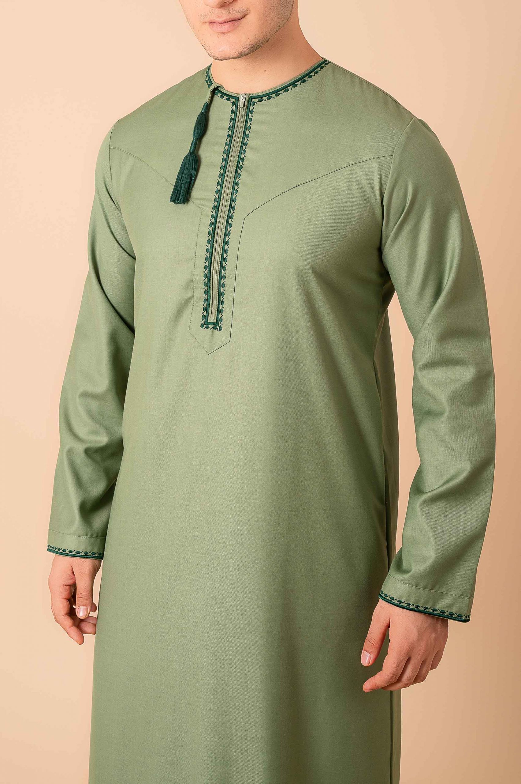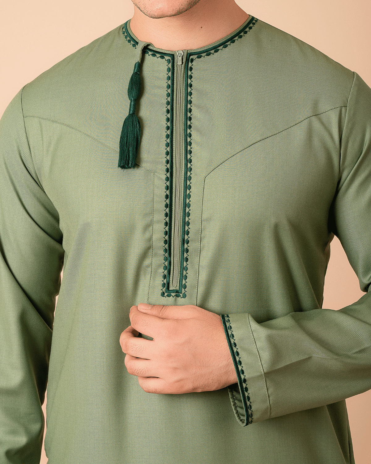 Elegant light olive green Omani thobe featuring refined dark green geometric embroidery and traditional tassel detailing.