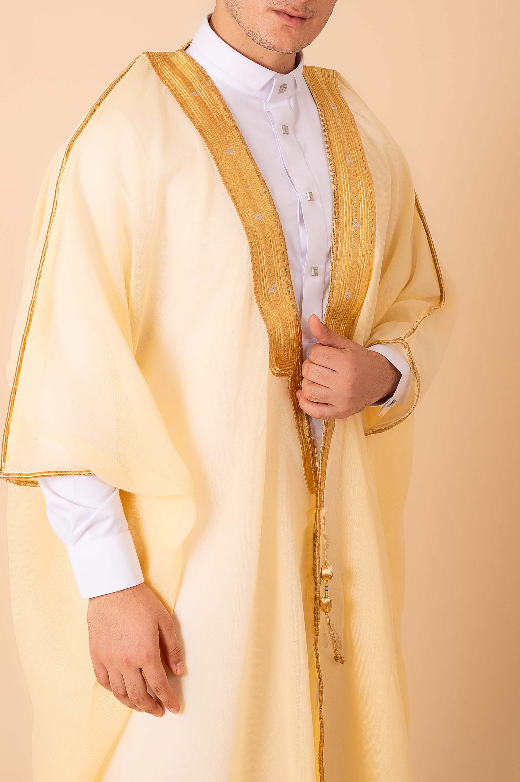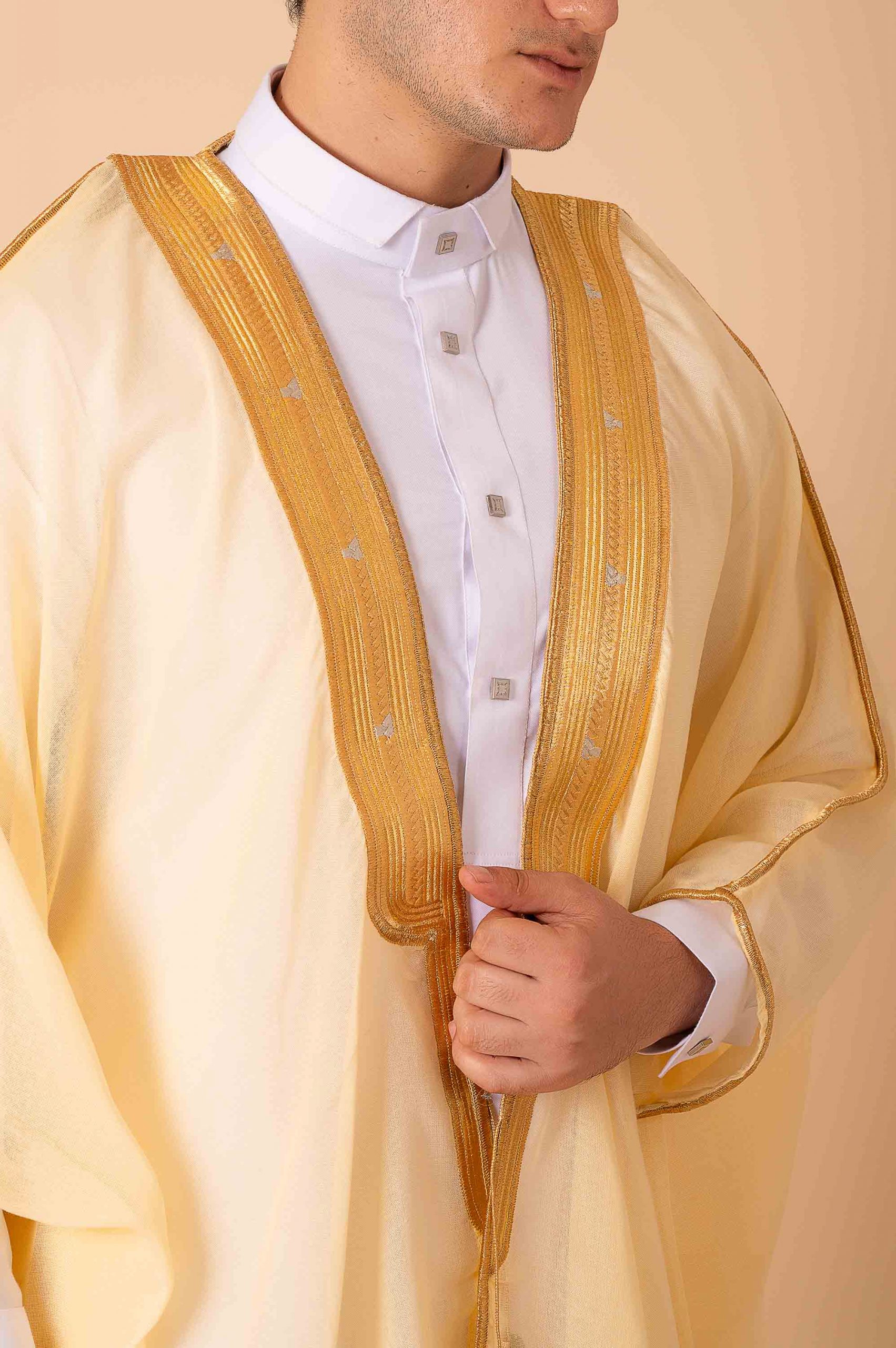 This cream Arabic bisht is crafted from lightweight flowing fabric and finished with rich gold zari (tilla) embroidery along the front opening and neckline for a refined traditional look.