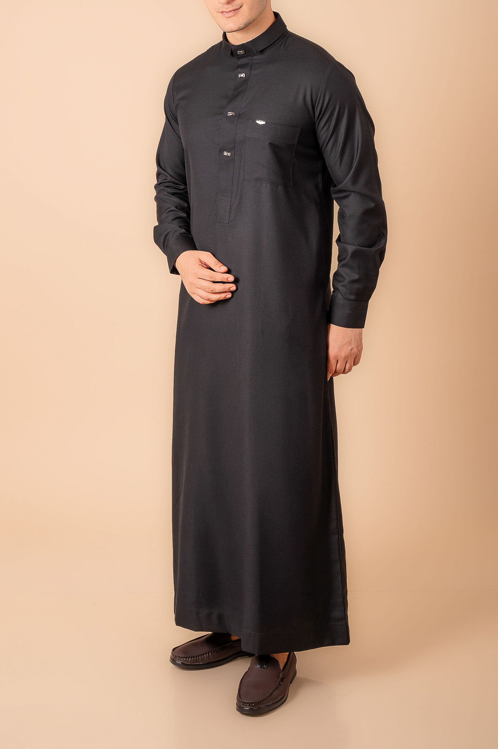 A premium deep black designer thobe featuring sleek gunmetal button accents and a sharp modern silhouette.