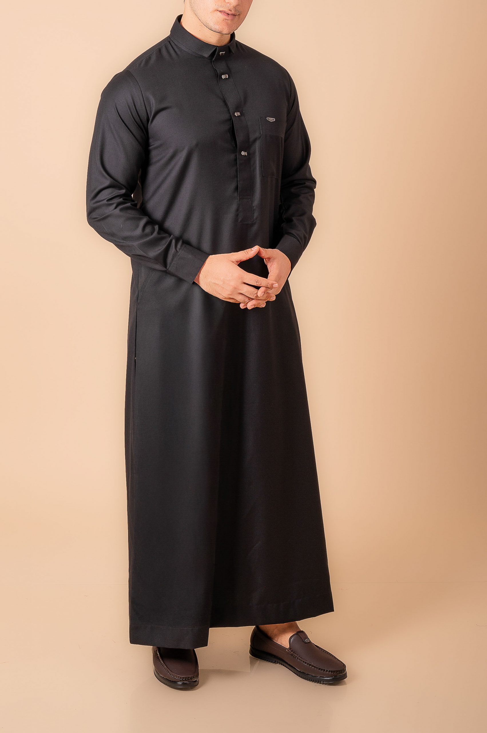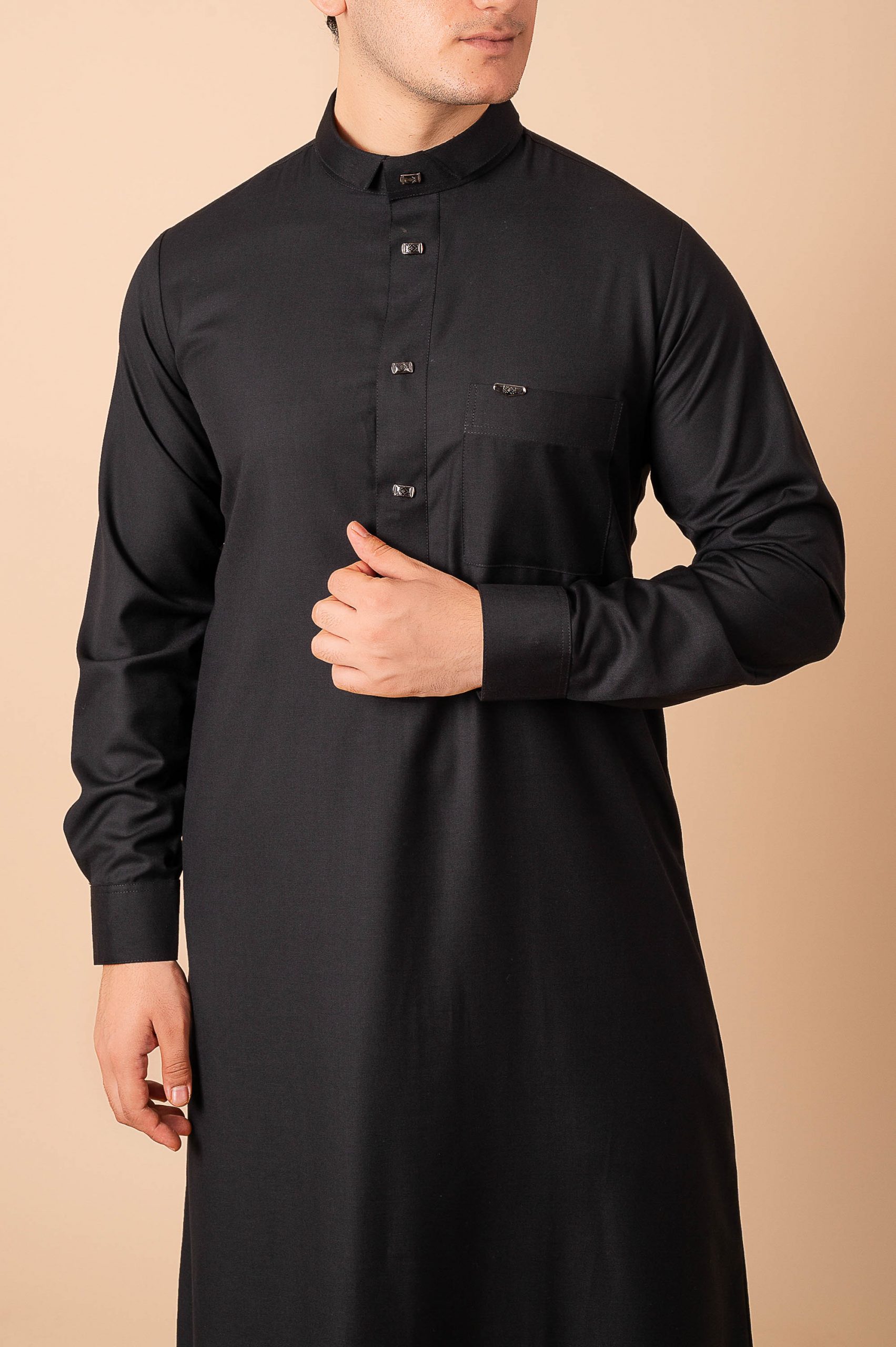 This luxury black designer thobe is tailored with a clean front placket and refined metal button detailing.