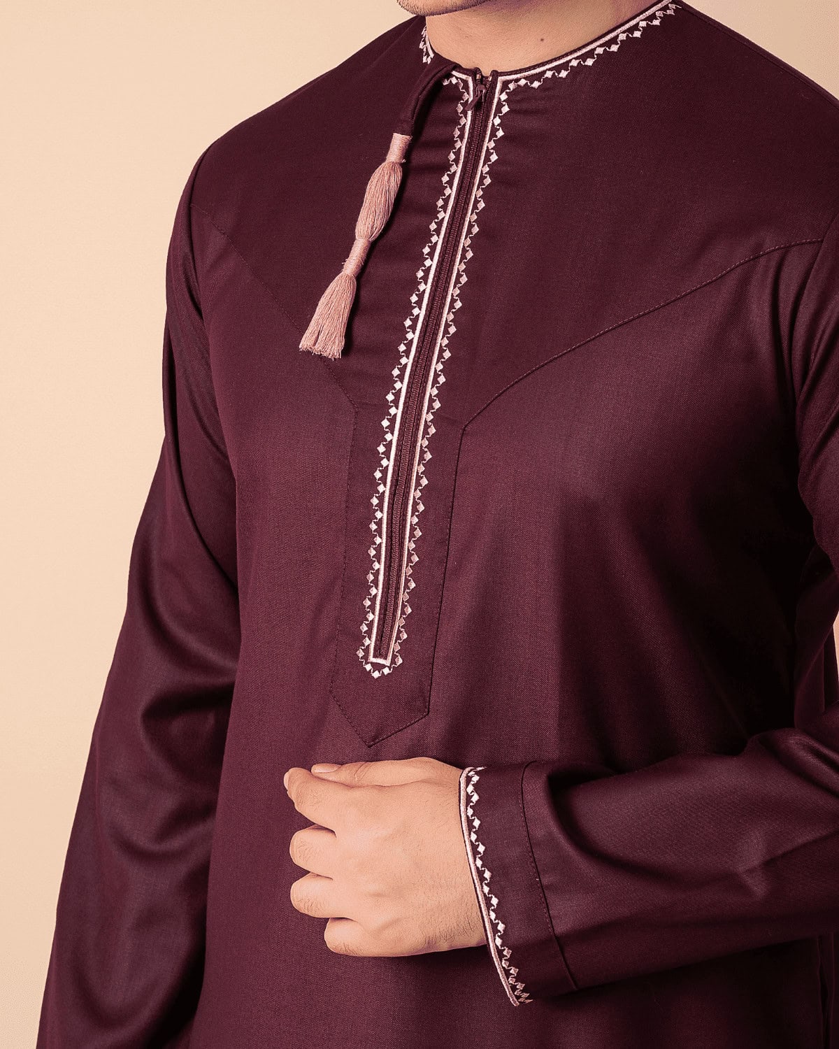 Elegant maroon Omani thobe featuring white geometric embroidery with a classic tassel finish.