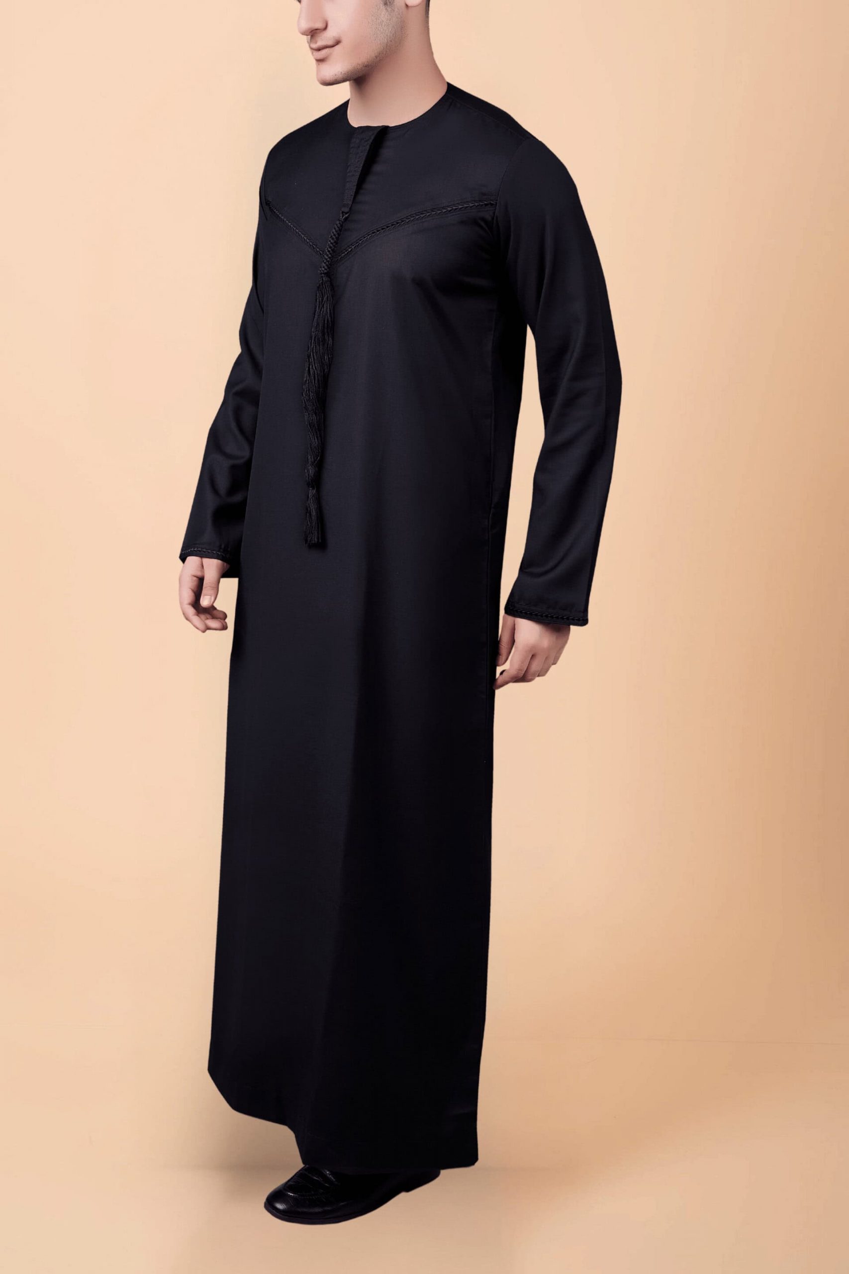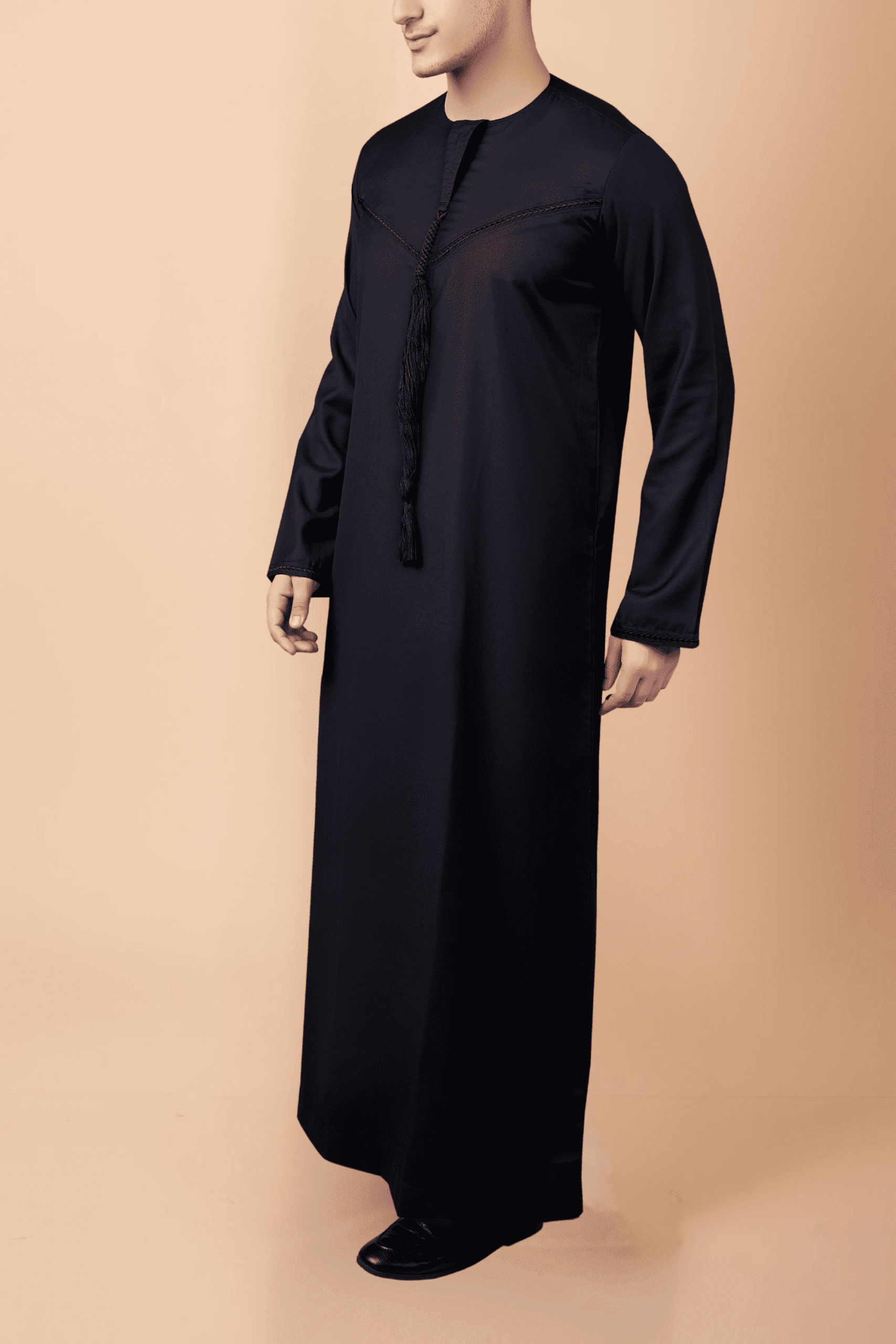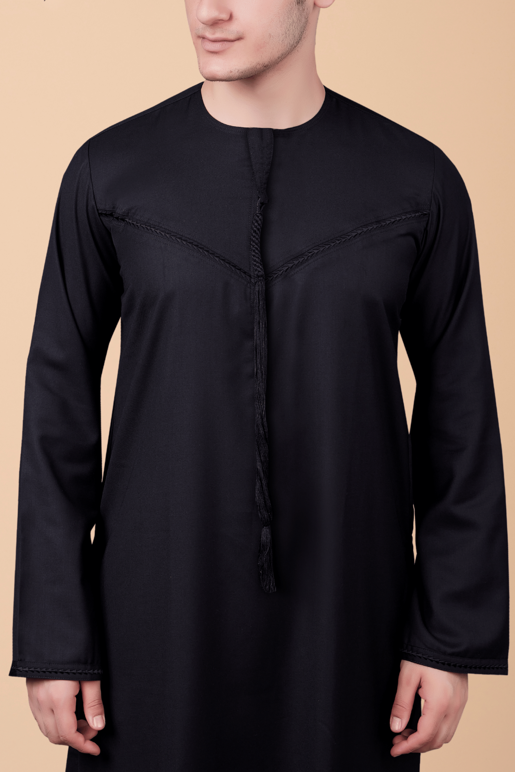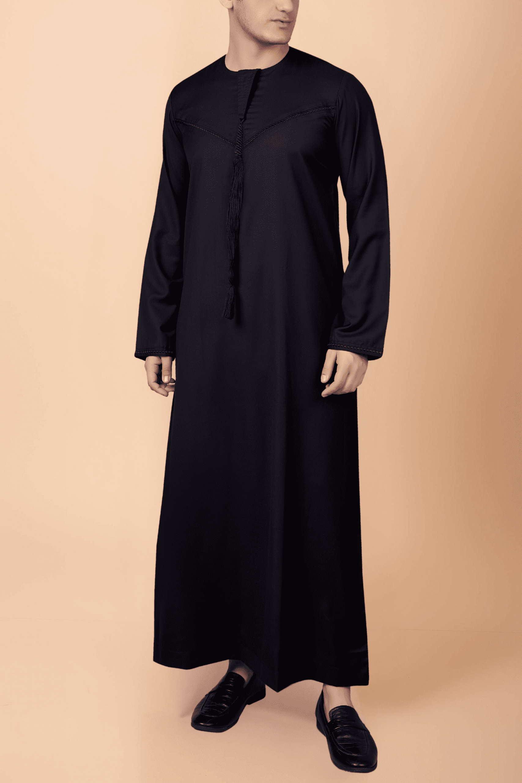 A premium black Emirati tassel thobe featuring elegant chevron stitching and a refined front tassel.