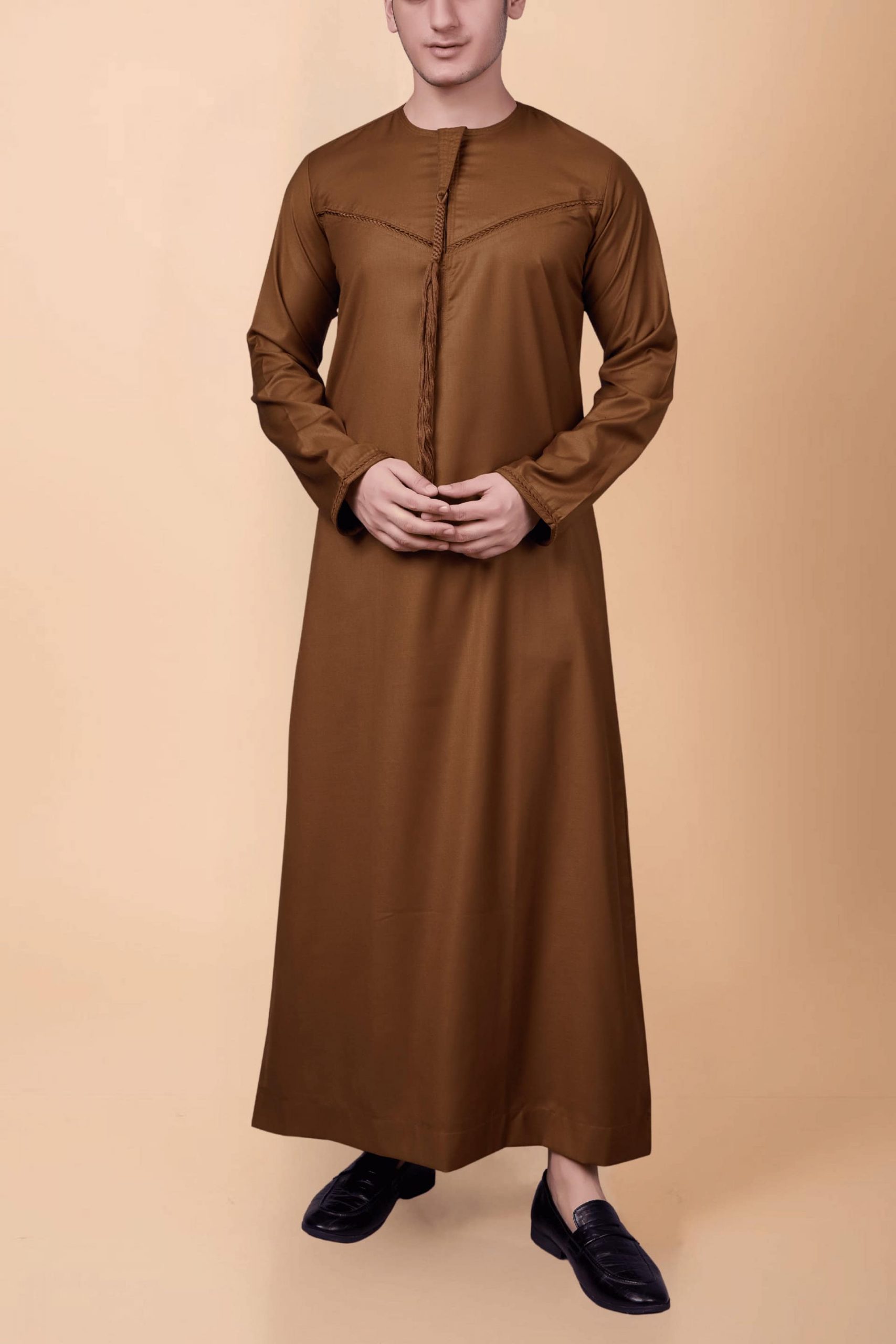 This Emirati-style thobe features a warm brown tone with a clean silhouette, enhanced by minimal stitch embroidery across the chest and a classic tassel placket. Designed for comfort and elegance, it is suitable for prayer, daily wear, and formal occasions..