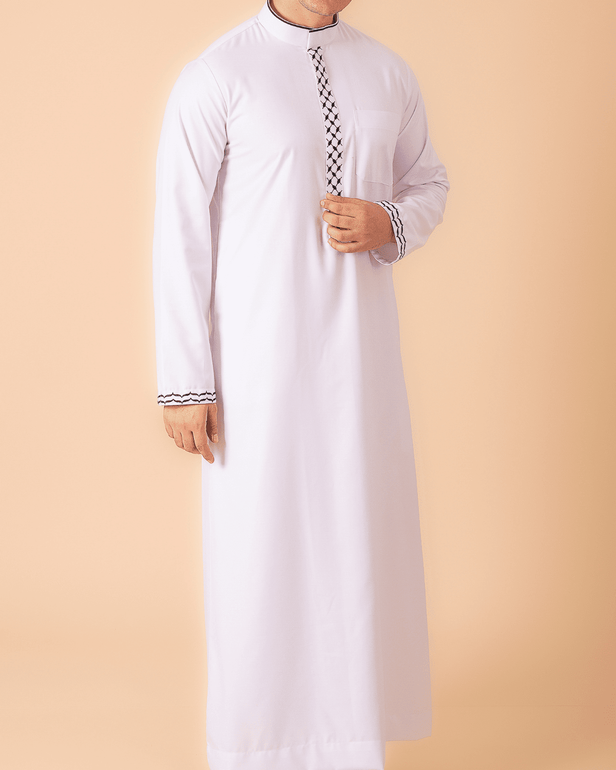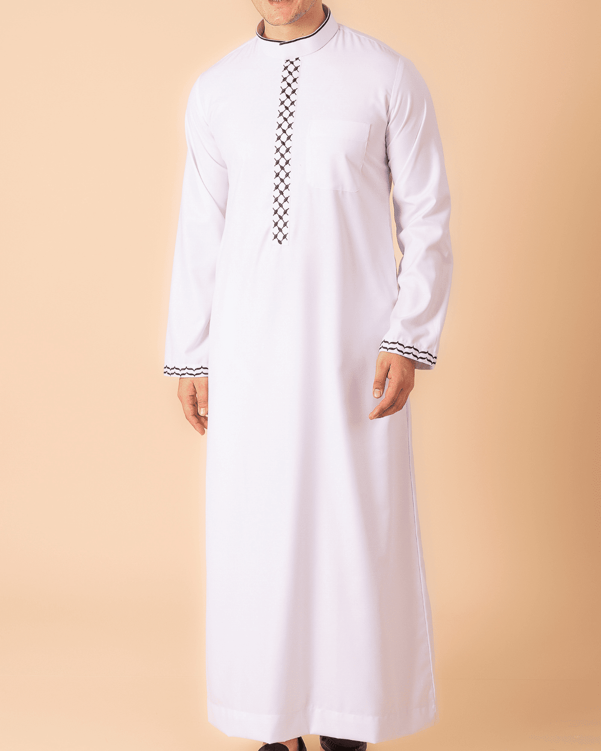 Men’s Classic White Thobe with Black Lattice Embroidery Strip & Contrast Cuff Trim