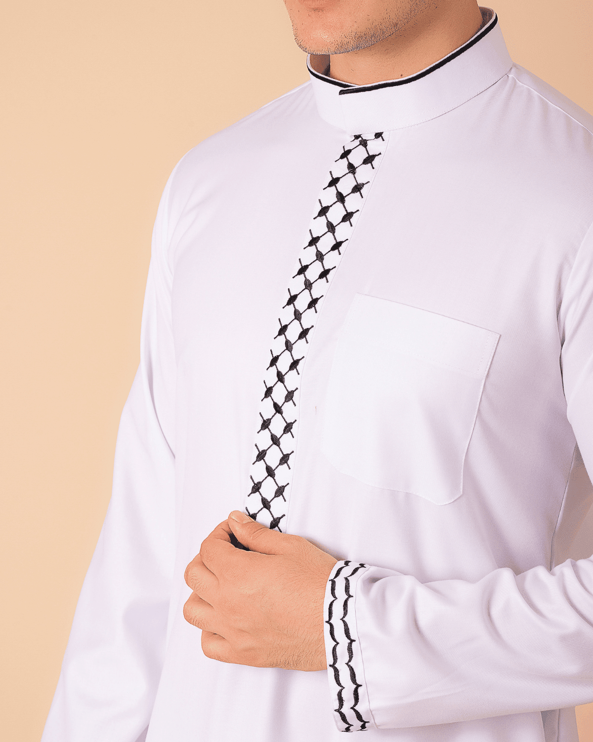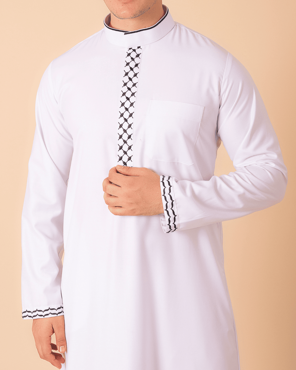A clean white thobe elevated with a black geometric embroidery strip, contrast cuffs, and a smart band collar for an elegant everyday look.