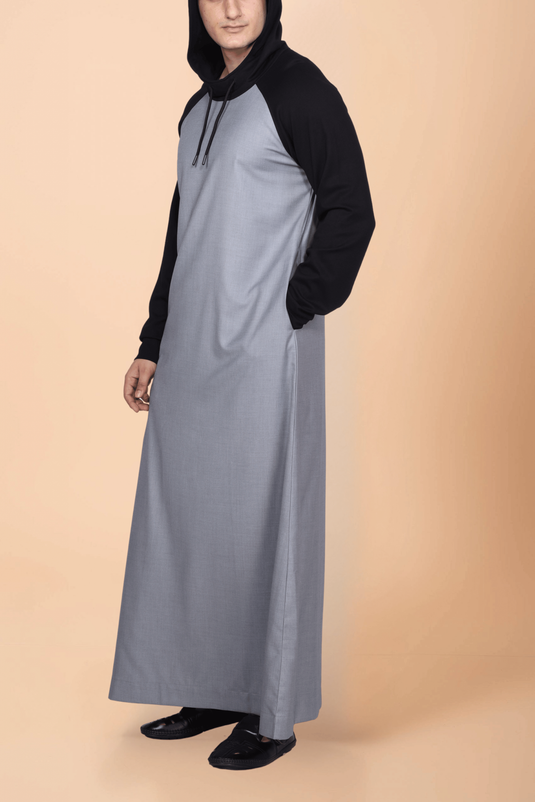 This modern hooded thobe features a smooth light grey body paired with solid black sleeves and a matching hood for a sharp, understated contrast. Designed with a pullover hood style and relaxed full-length fit, it offers everyday comfort with contemporary Islamic wear appeal.