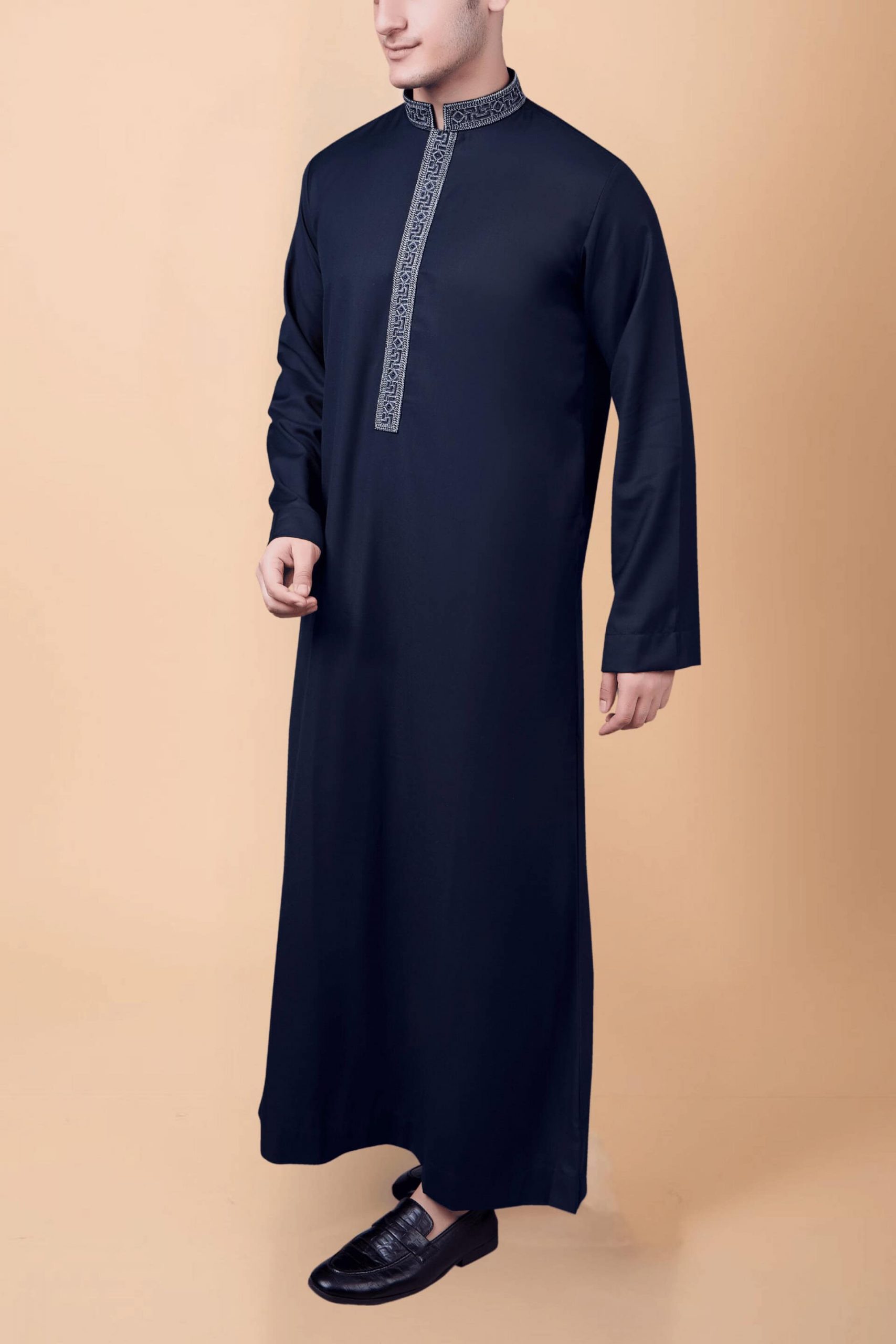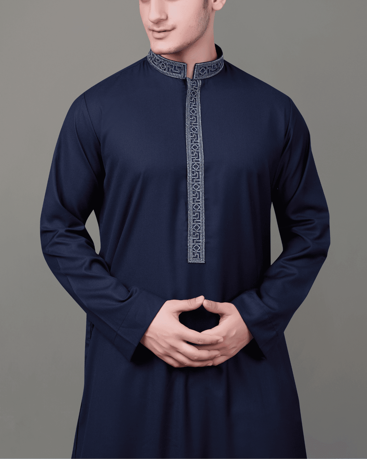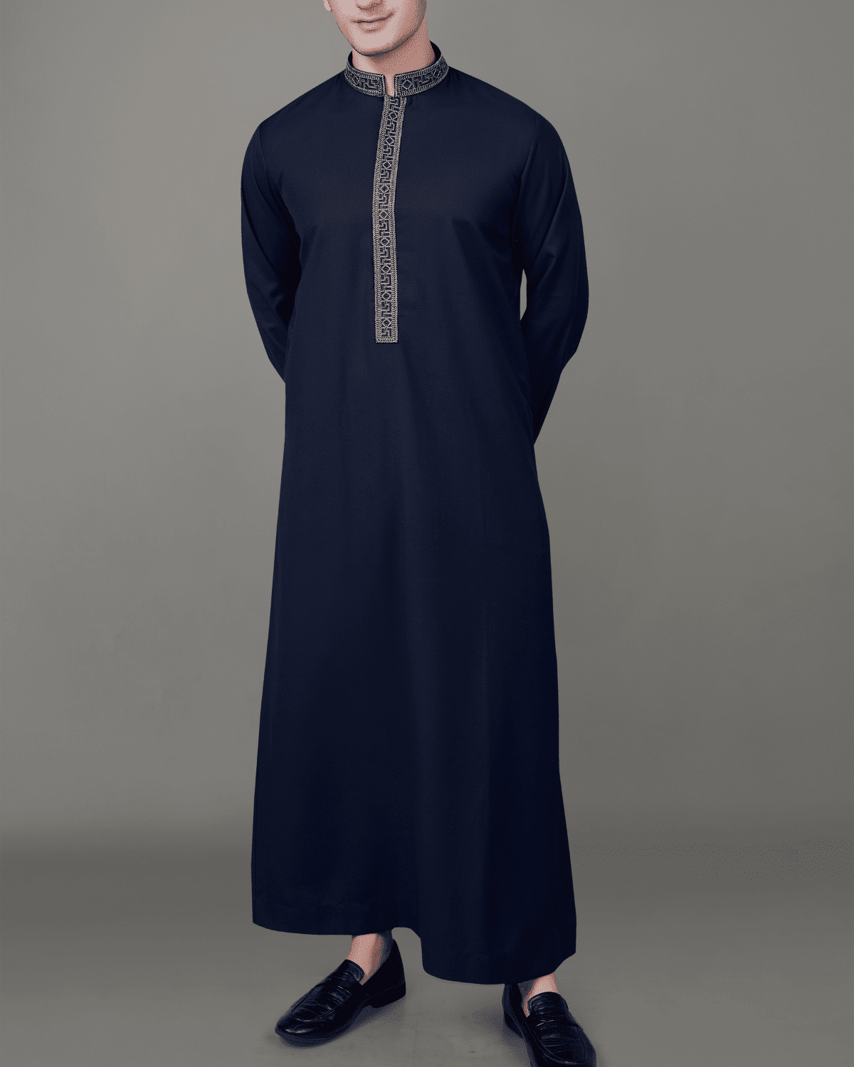 This premium navy blue thobe is designed with a straight, flowing silhouette and accented by a silver geometric embroidery strip running along the placket and collar. The minimalist design combined with detailed embroidery makes it ideal for prayers, occasions, and everyday modest wear.