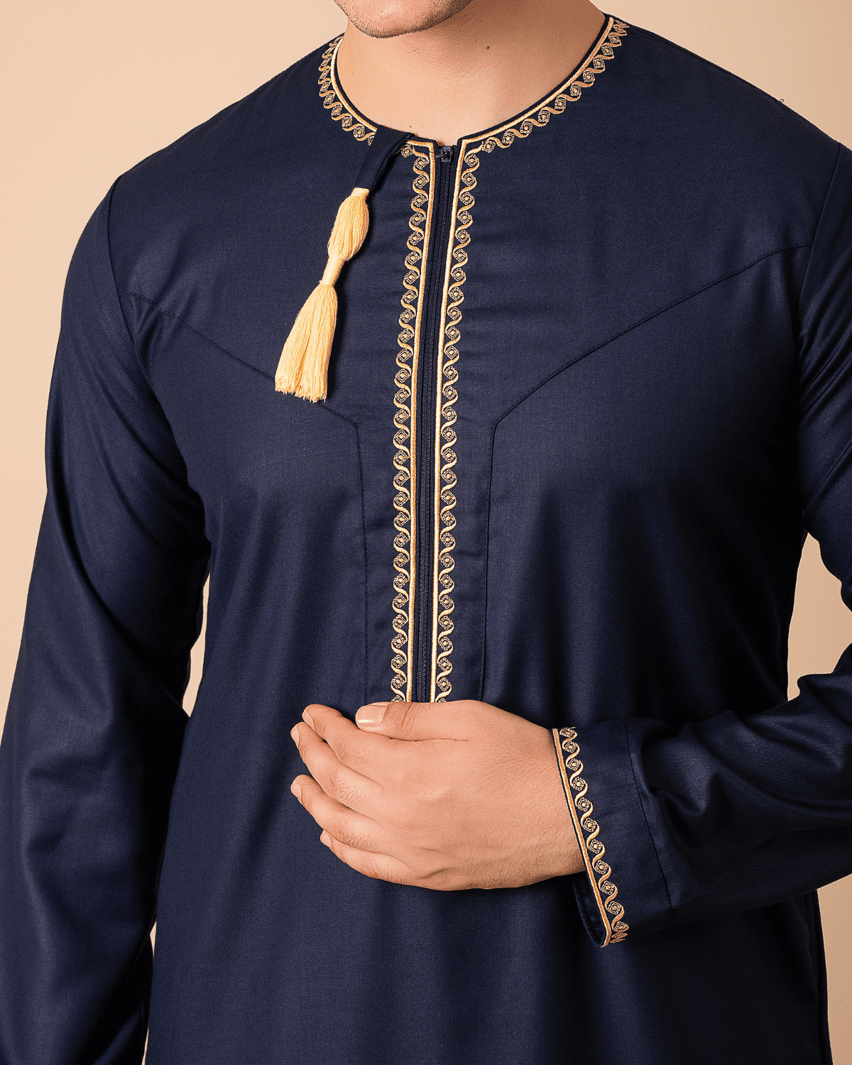 Premium navy blue Omani thobe featuring elegant gold geometric embroidery and traditional tassel detailing.