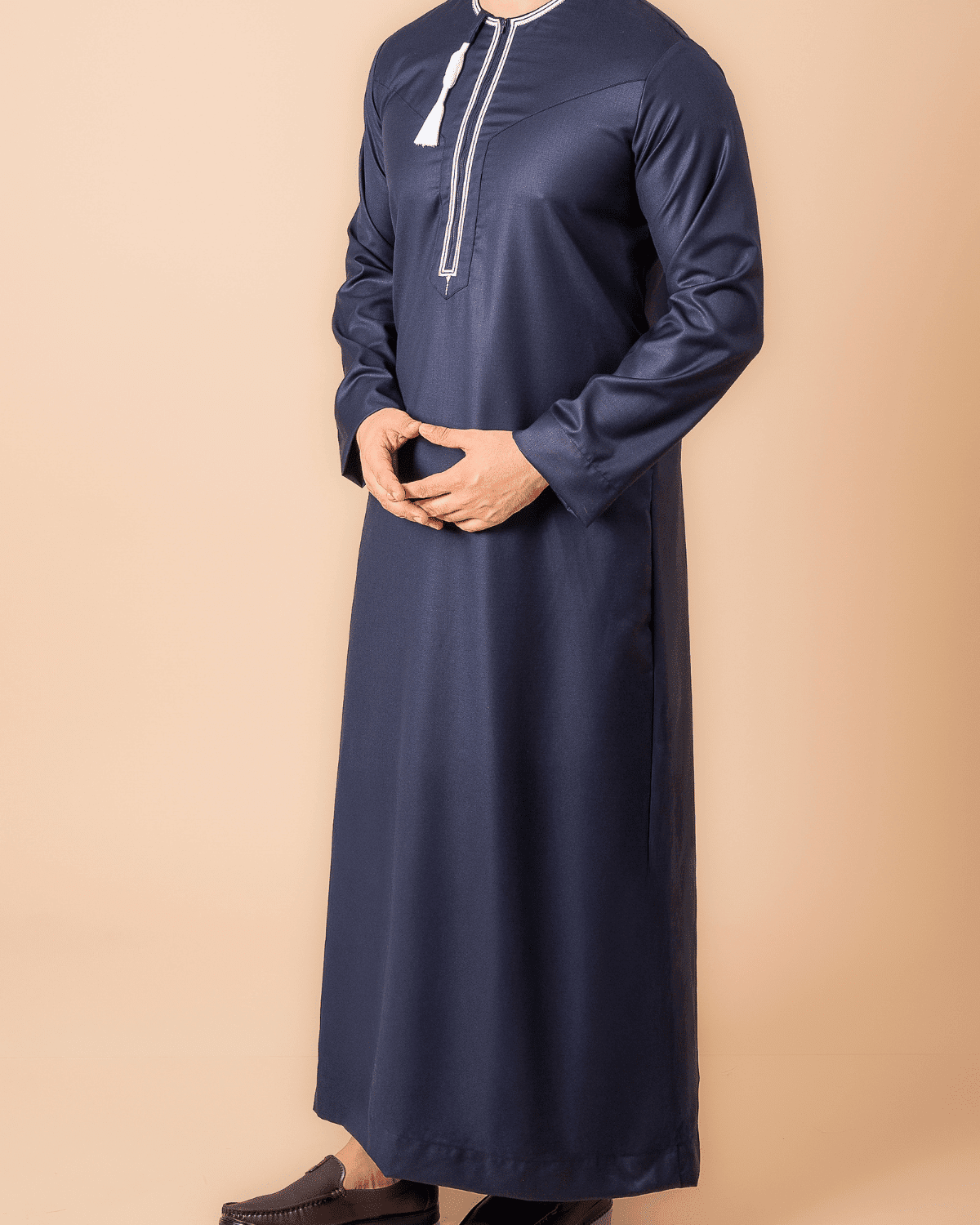 Be the first to review “Navy Blue Omani Thobe with White Embroidered Placket & Tassel”