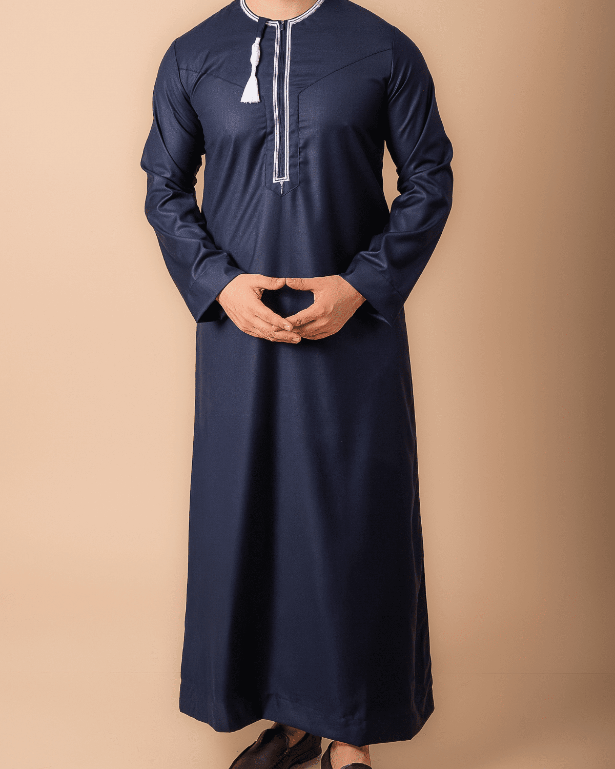 Authentic Omani StyleWhite Geometric EmbroideryTraditional Tassel DetailPremium Navy FabricPrayer & Occasion ReadyModest Full Length Fit