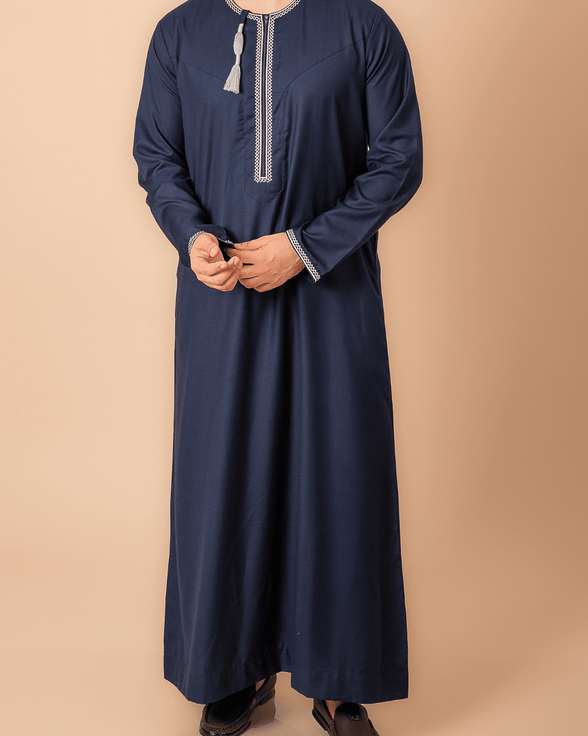 This refined navy blue Omani thobe showcases traditional white geometric embroidery along the front placket and cuffs for a timeless Gulf look. Finished with an authentic Omani tassel and modest full-length fit, it is perfect for prayers, Eid, and formal occasions.