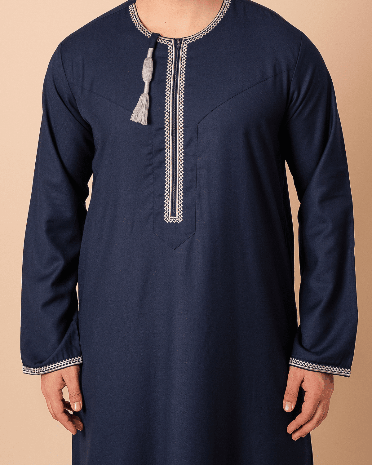 Be the first to review “Navy Blue Omani Thobe with White Geometric Embroidery & Tassel”