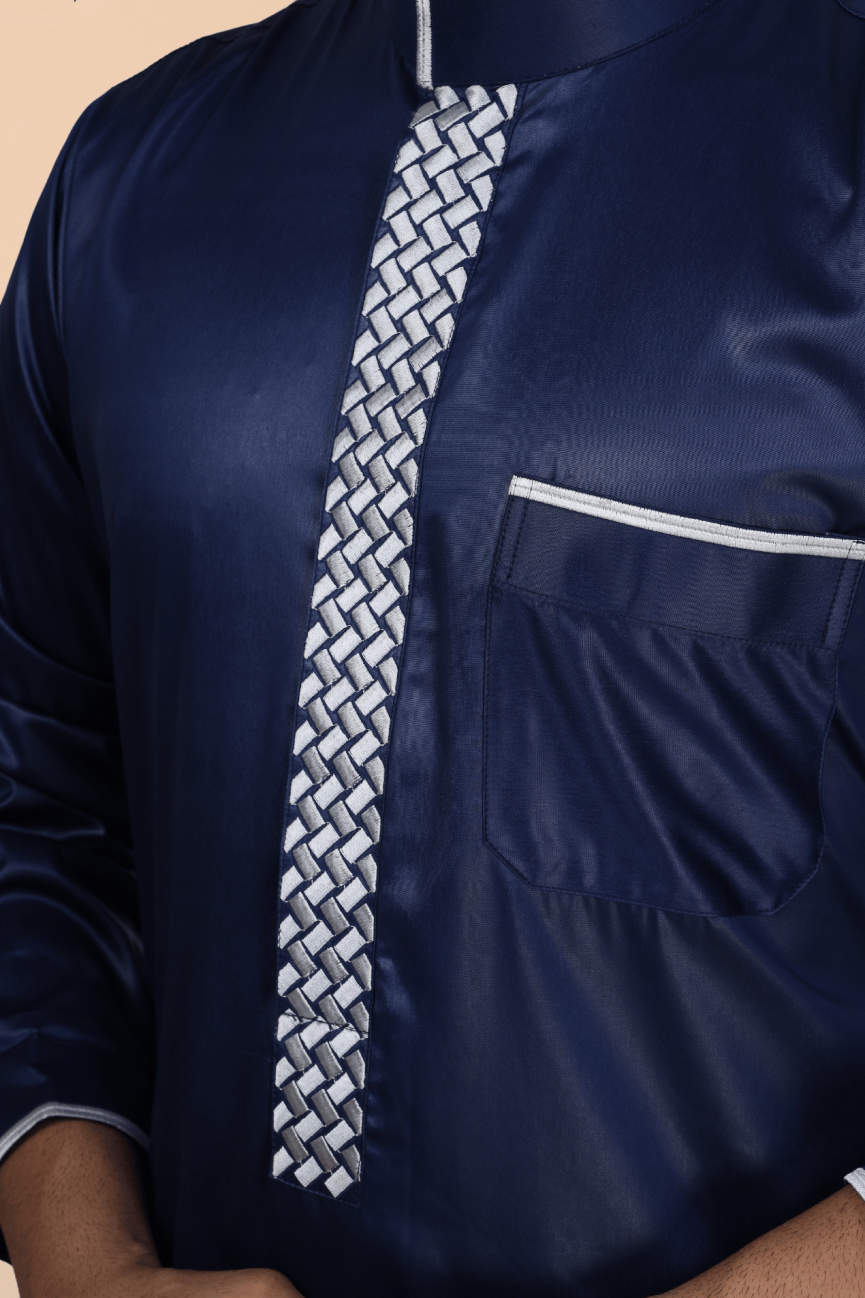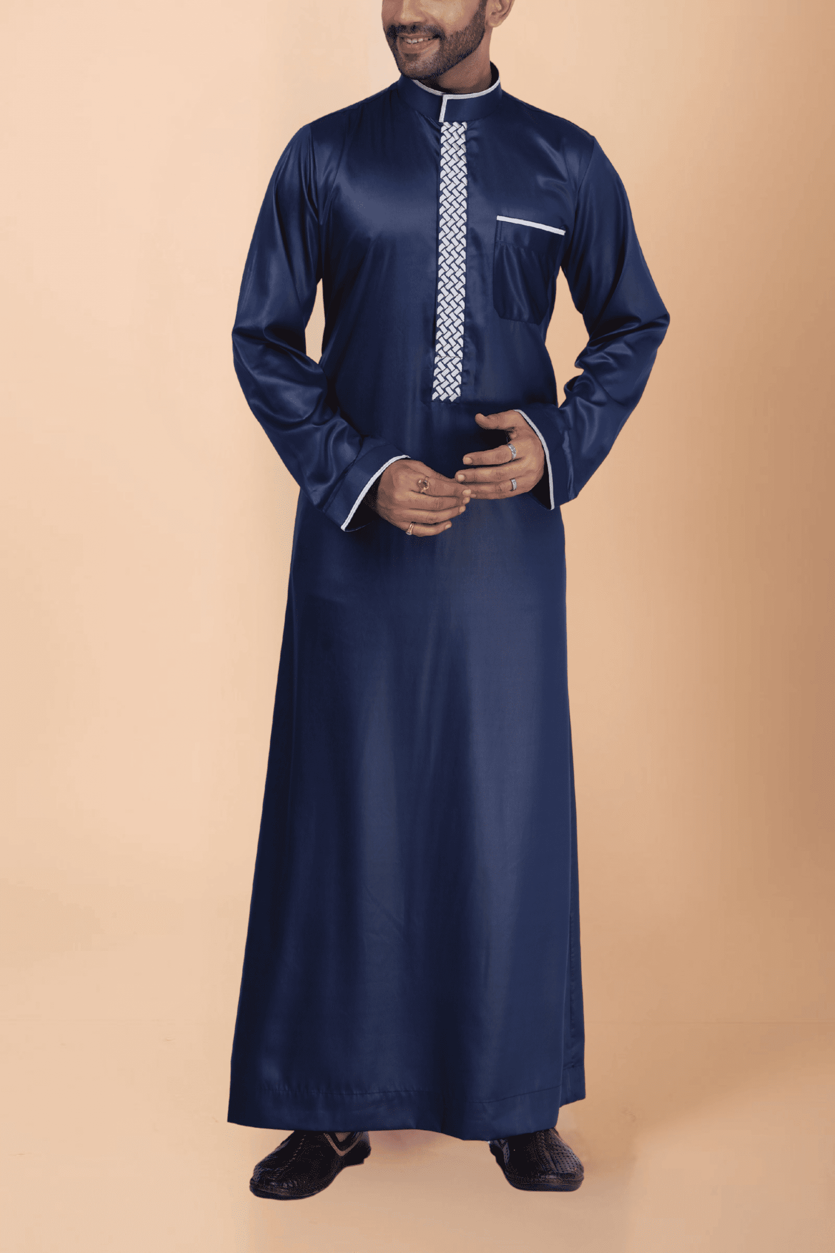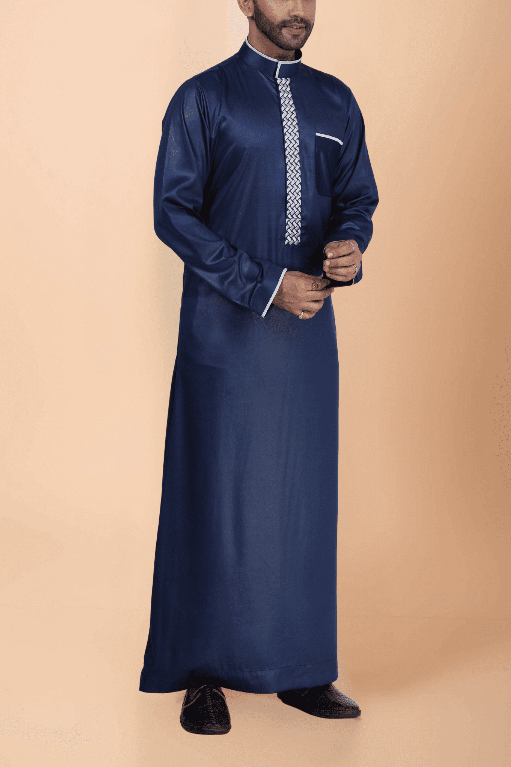 This premium navy blue thobe is enhanced with a bold white geometric embroidery strip along the front placket for a sophisticated Islamic look. Finished with a contrast band collar, piped cuffs, and pocket trim, it is ideal for prayers, Eid, and formal occasions.
