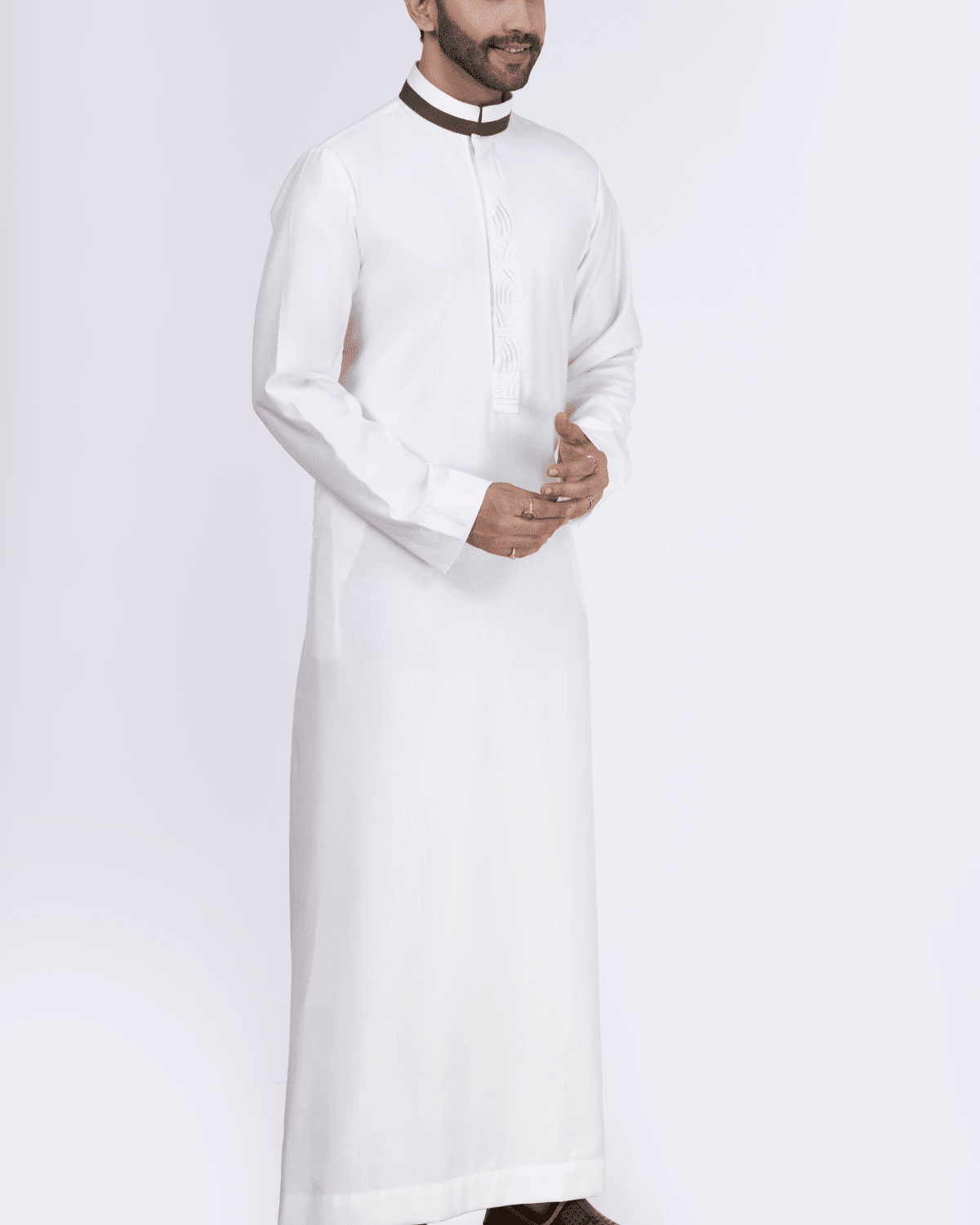 This refined off-white thobe is designed with a same-tone vertical embroidered strip that adds depth without overpowering its clean aesthetic. Finished with a contrast band collar and a smooth flowing silhouette, it is ideal for prayers, Eid, and formal Islamic wear.