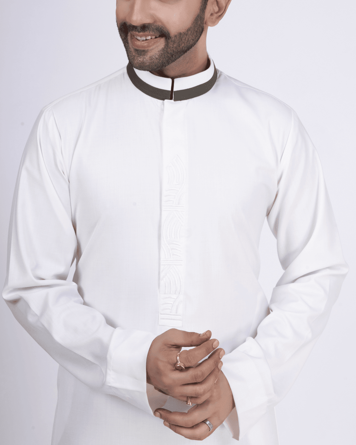 Sophisticated off-white thobe featuring subtle tonal embroidery with a contrast band collar finish.