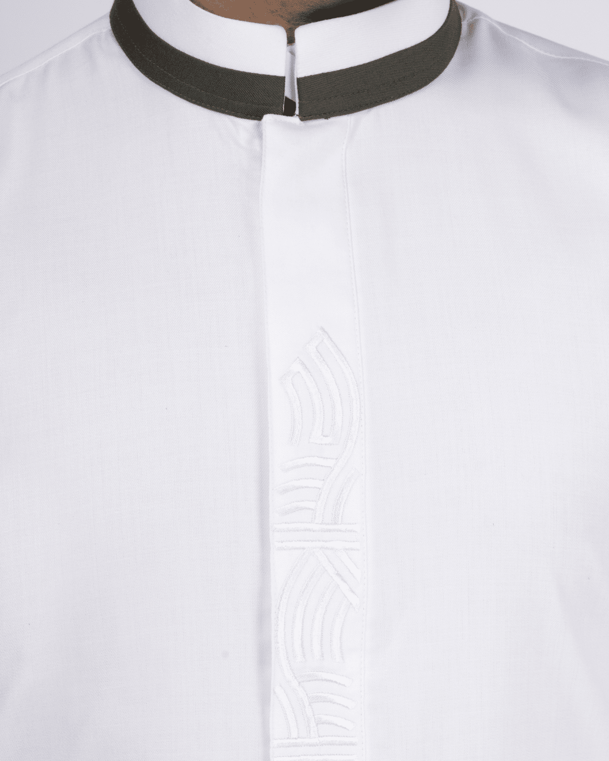 Off-White Thobe with Tonal Embroidery Strip & Contrast Band Collar