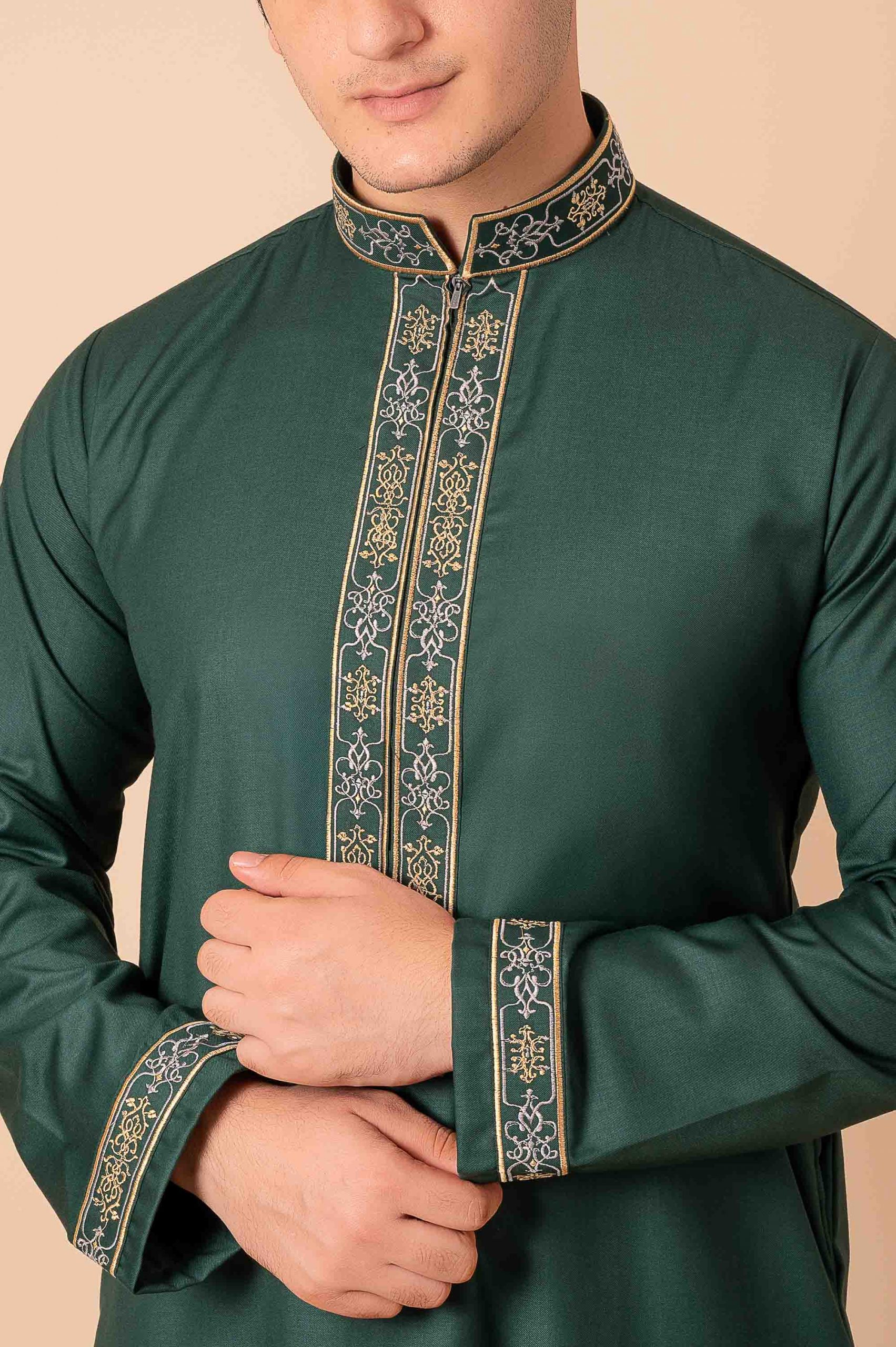 Elegant olive green men’s thobe detailed with refined gold geometric embroidery on the placket and collar for a premium Islamic look.