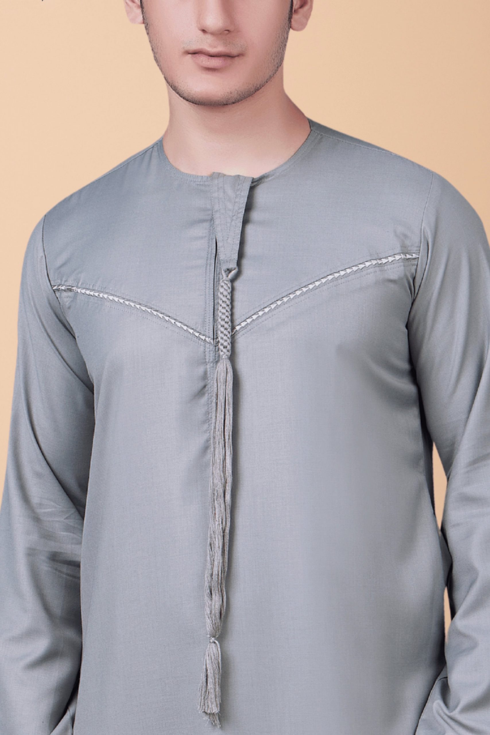 A refined ash grey Emirati thobe featuring elegant zigzag embroidery and a classic braided tassel.