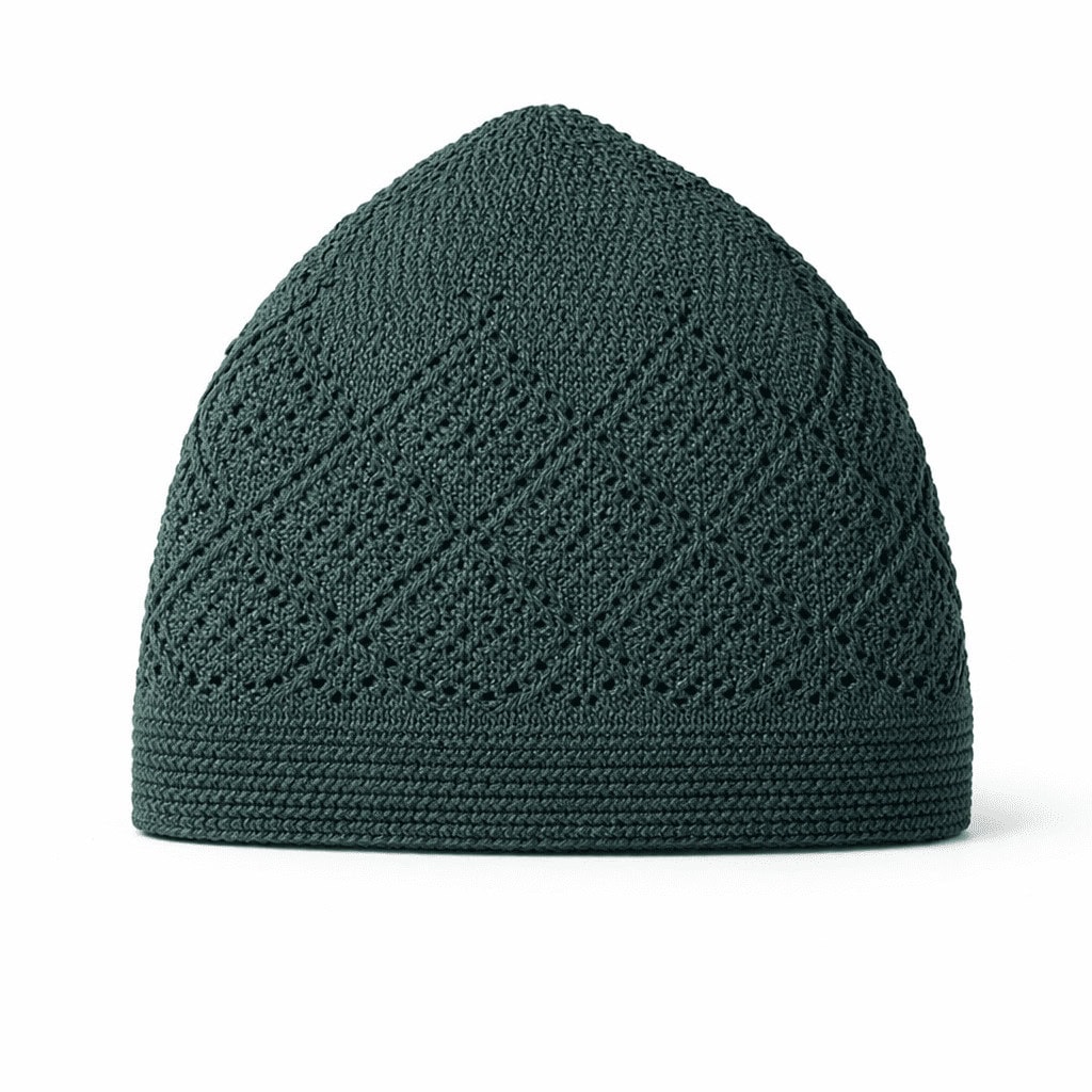 This dark green knitted kufi prayer cap is designed with a refined openwork geometric pattern that enhances airflow and comfort.