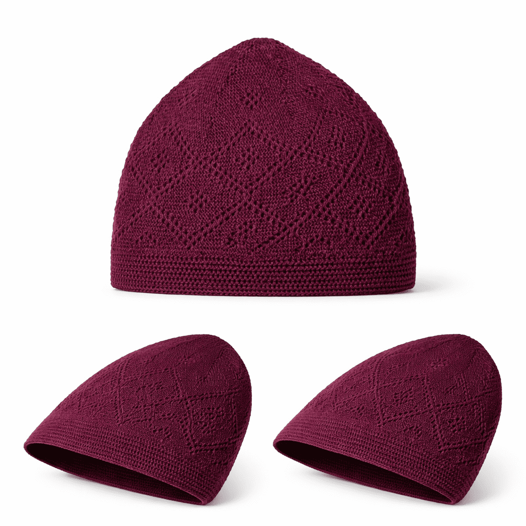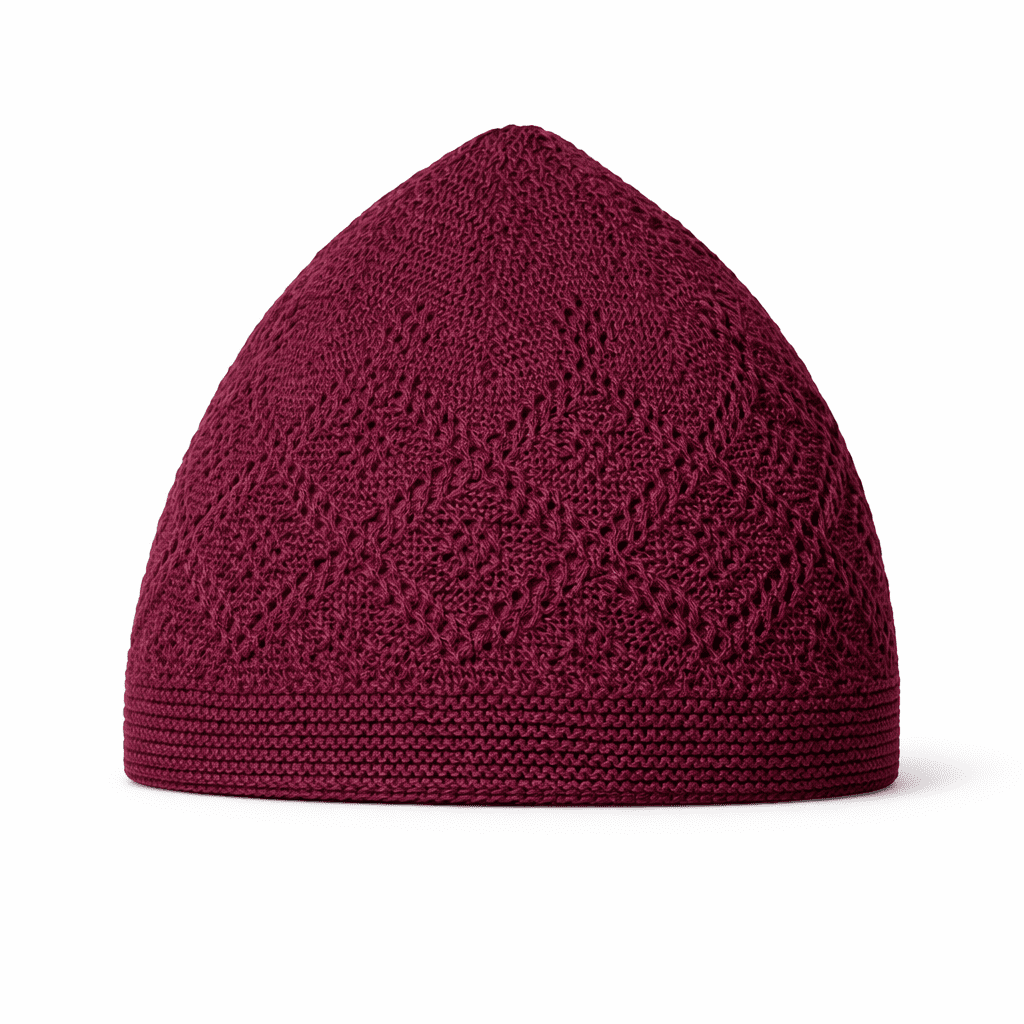 This premium maroon kufi prayer cap features a refined diamond openwork knit that enhances airflow and all-day comfort.