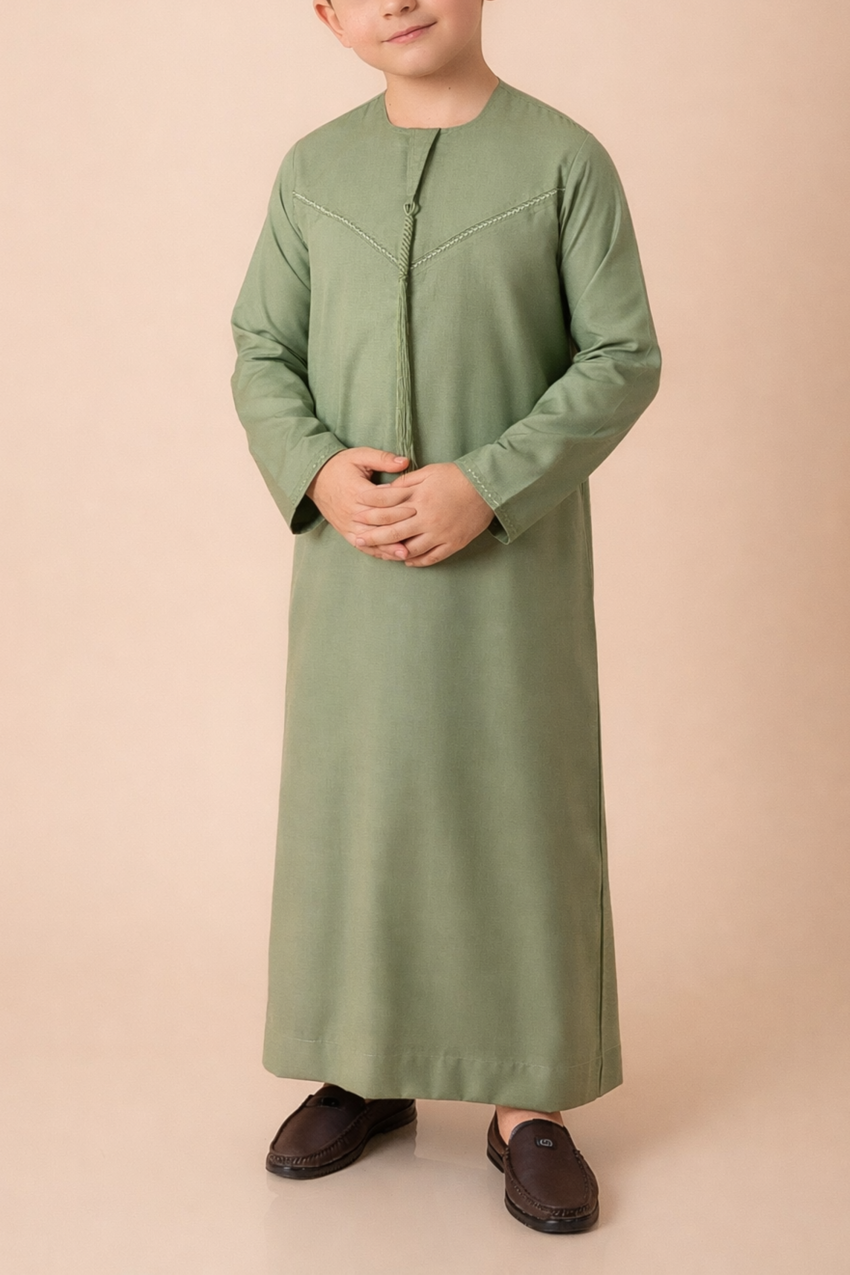 Refined olive green Emirati-style kids thobe featuring braided V-stitch detailing and traditional tassel.
