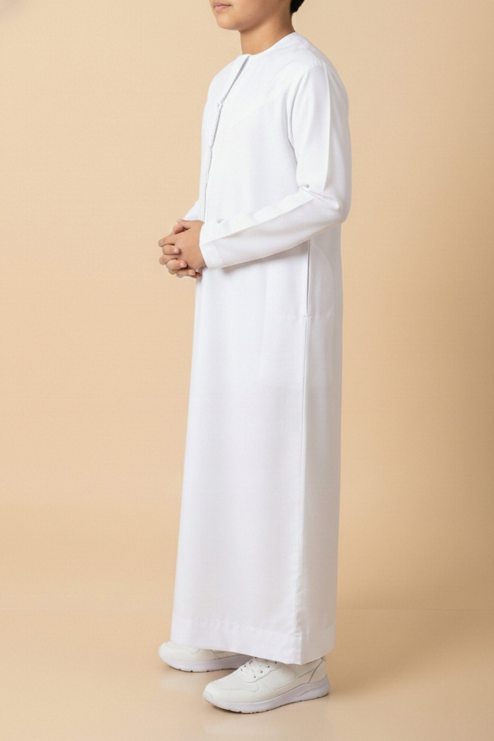 This pure white kids thobe reflects authentic Emirati elegance with a clean, luxurious finish.