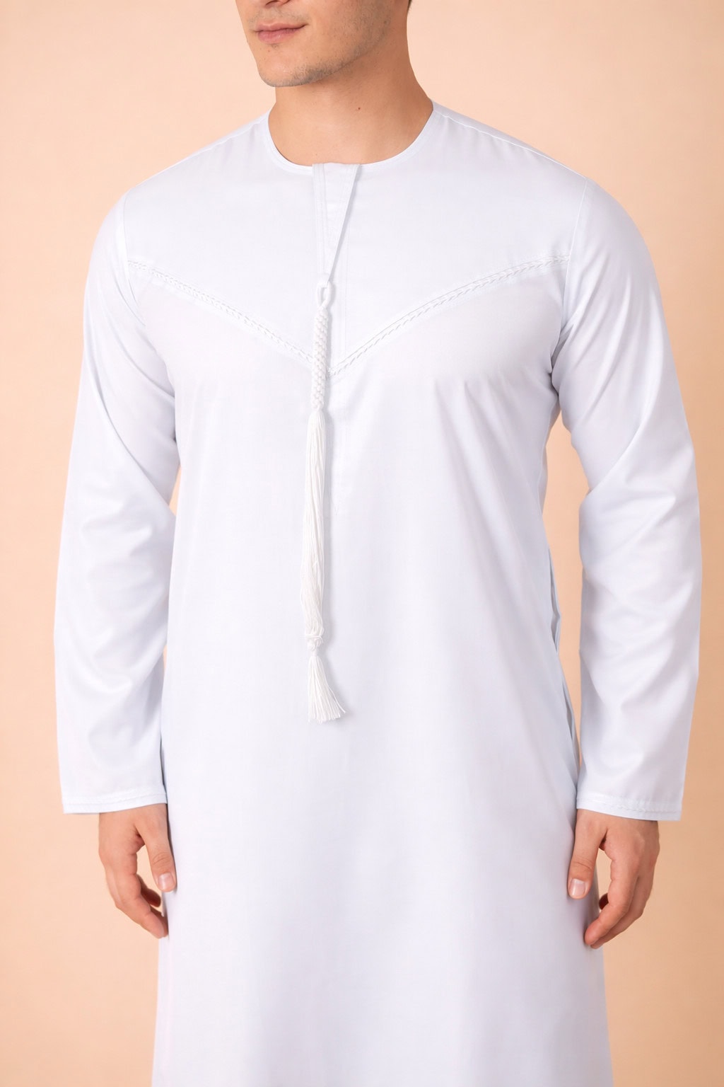 Premium Pure White Emirati Tassel Thobe with Tonal Embroidered Detailing