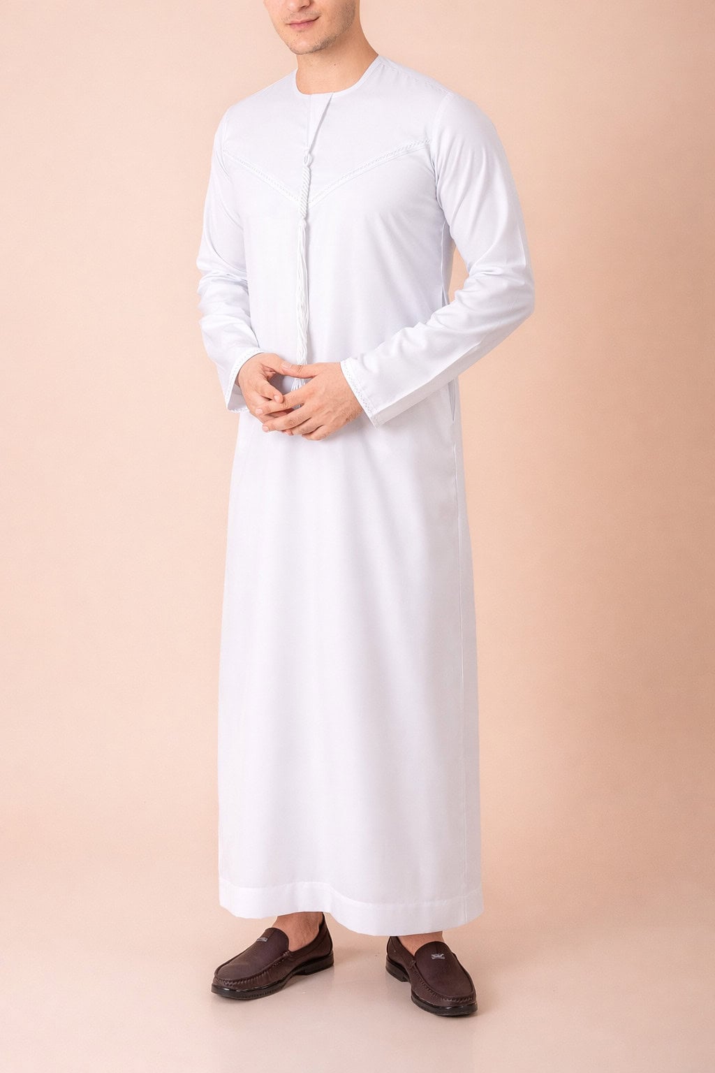 An elegant pure white Emirati thobe featuring refined tonal embroidery and signature braided tassel.