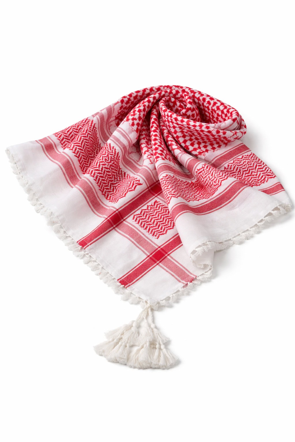 Authentic red and white shemagh scarf designed with traditional woven patterns and tassel edges.