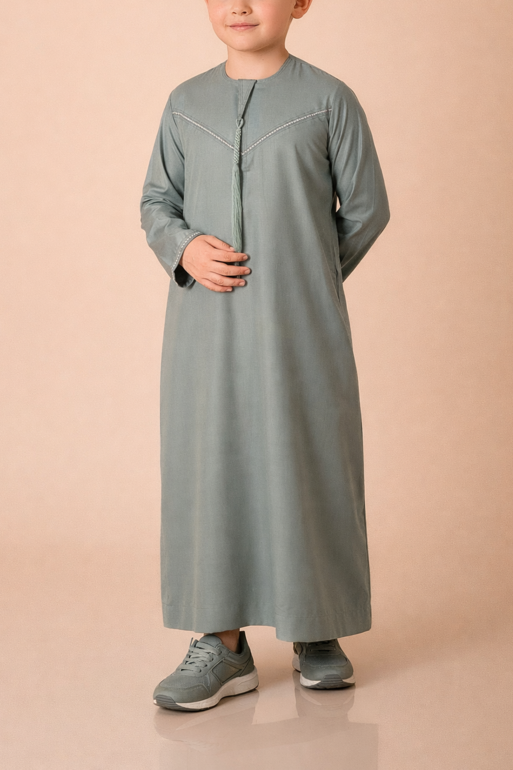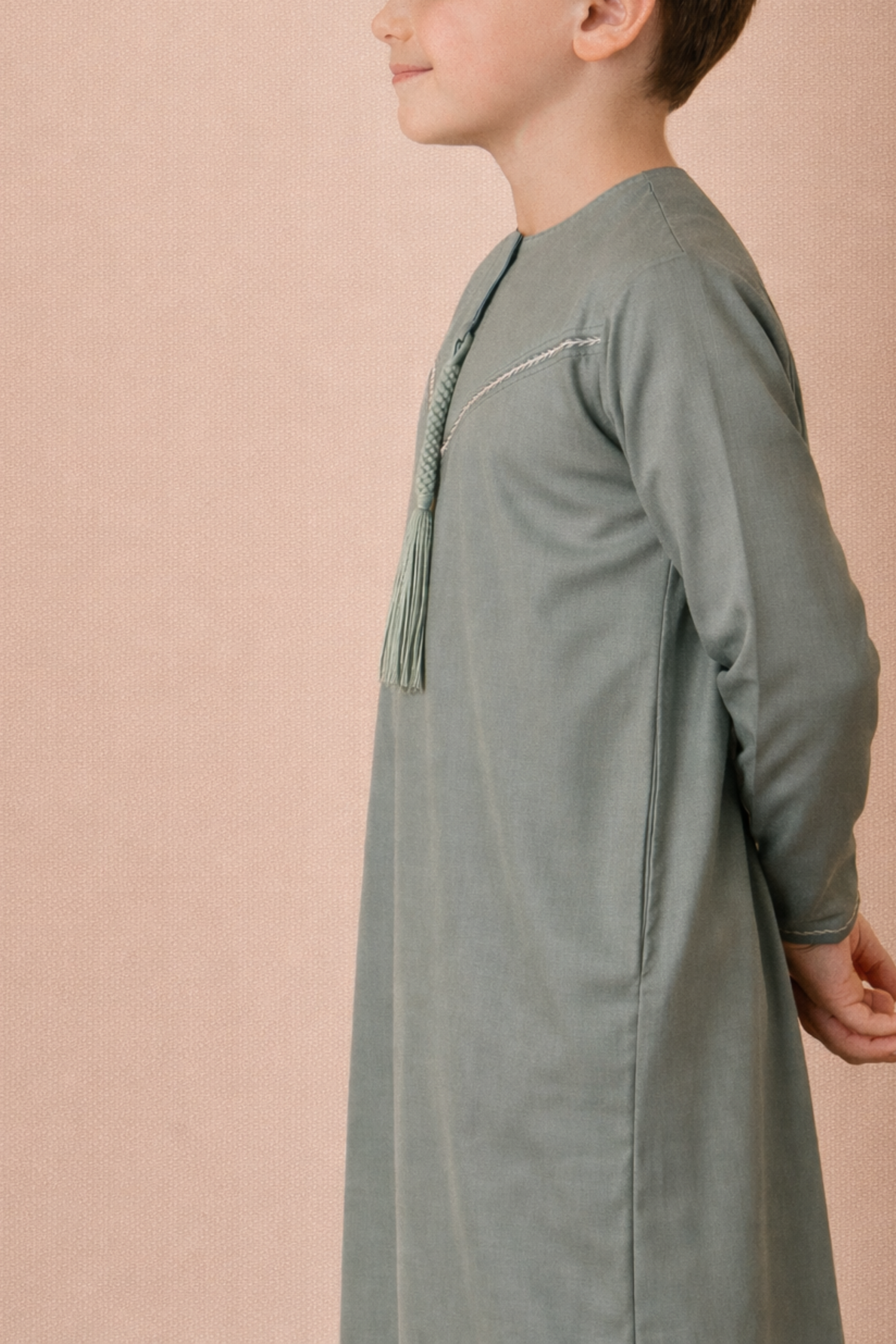 Elegant sage green Emirati-style kids thobe featuring refined contrast V-stitch detailing and traditional tassel.