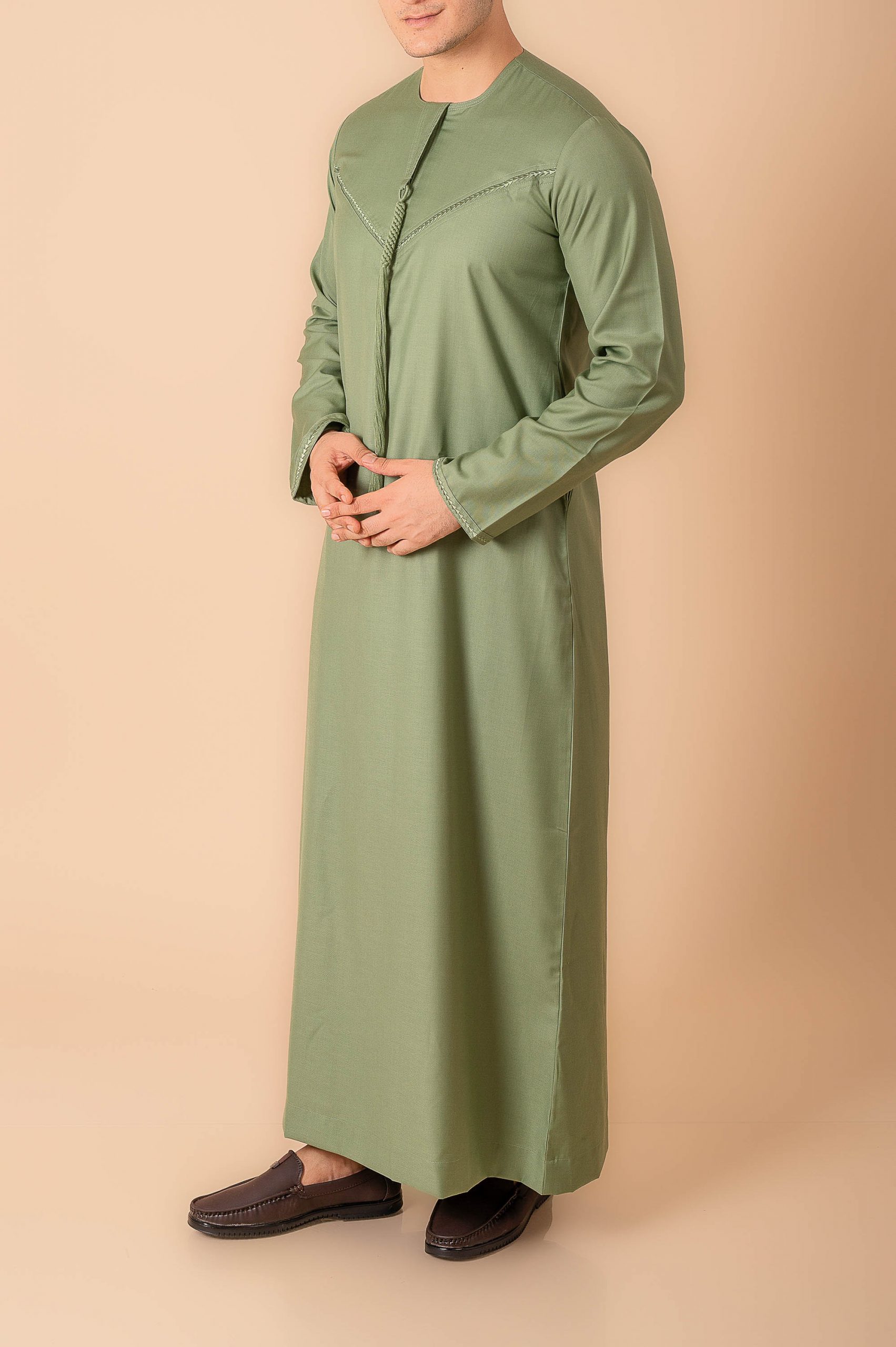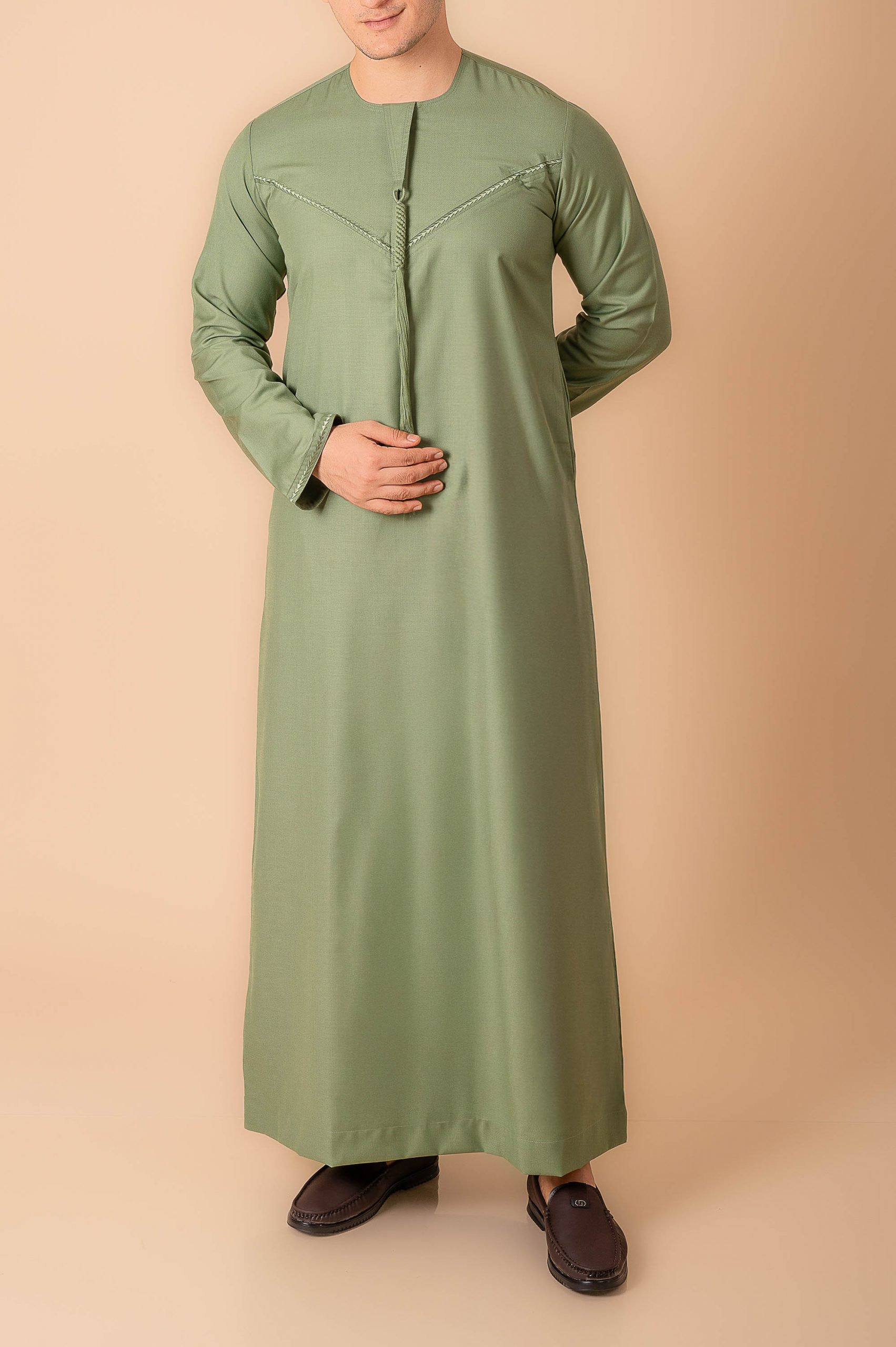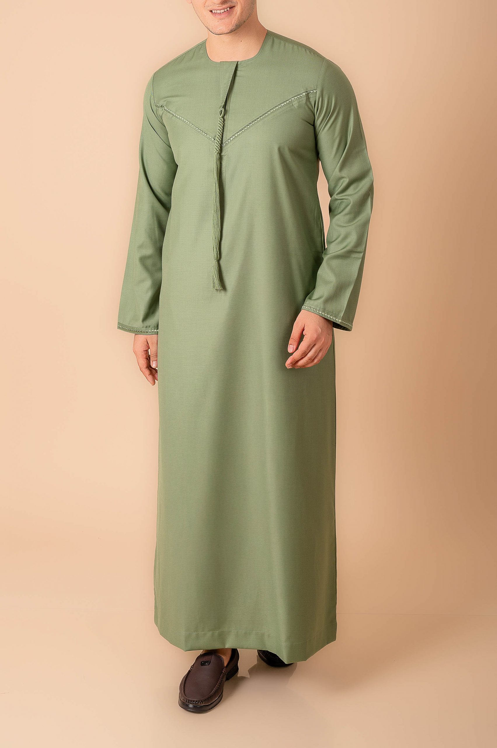 A premium sage green Emirati thobe featuring refined light grey braided detailing and a classic front tassel.