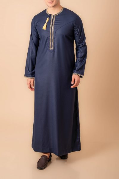 This elegant men’s kandura features a smooth-flowing sage green fabric with a modern Emirati silhouette.