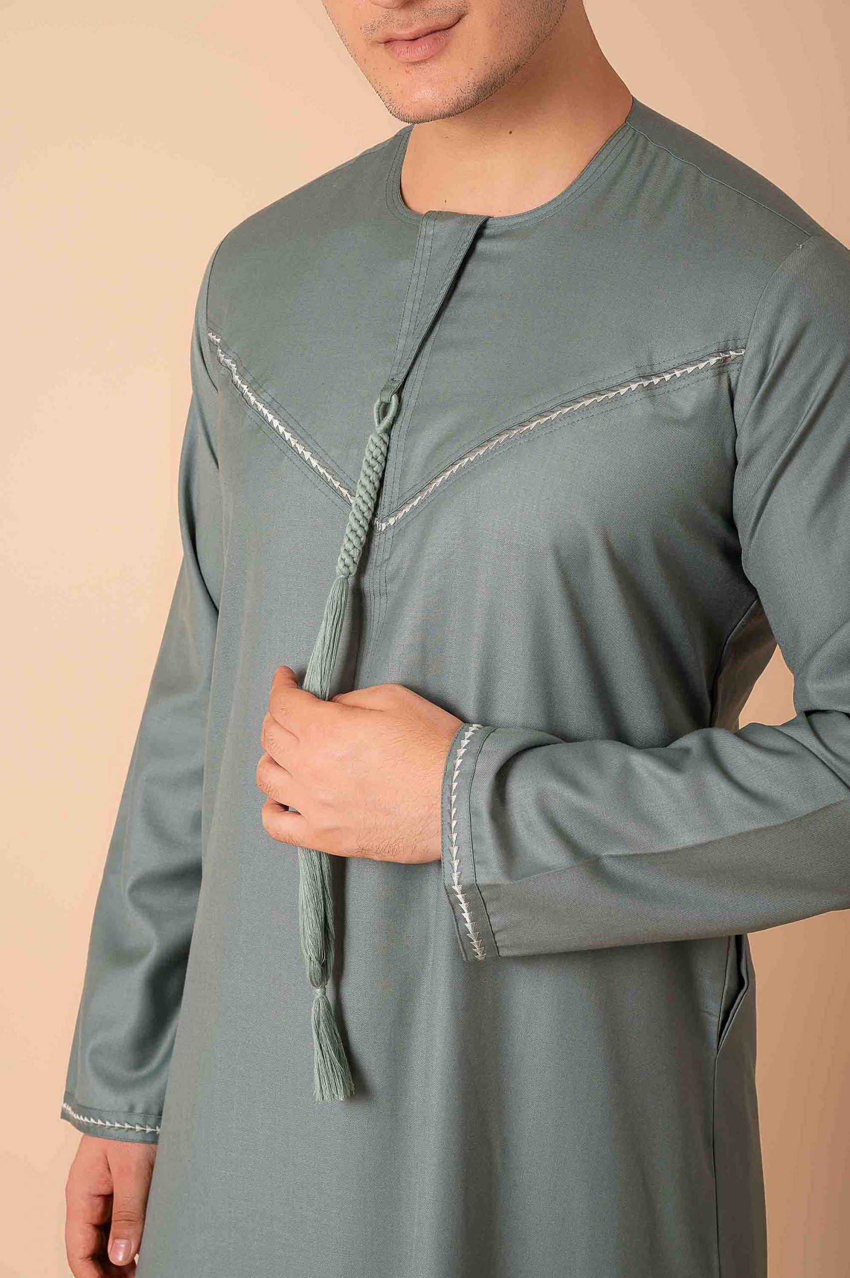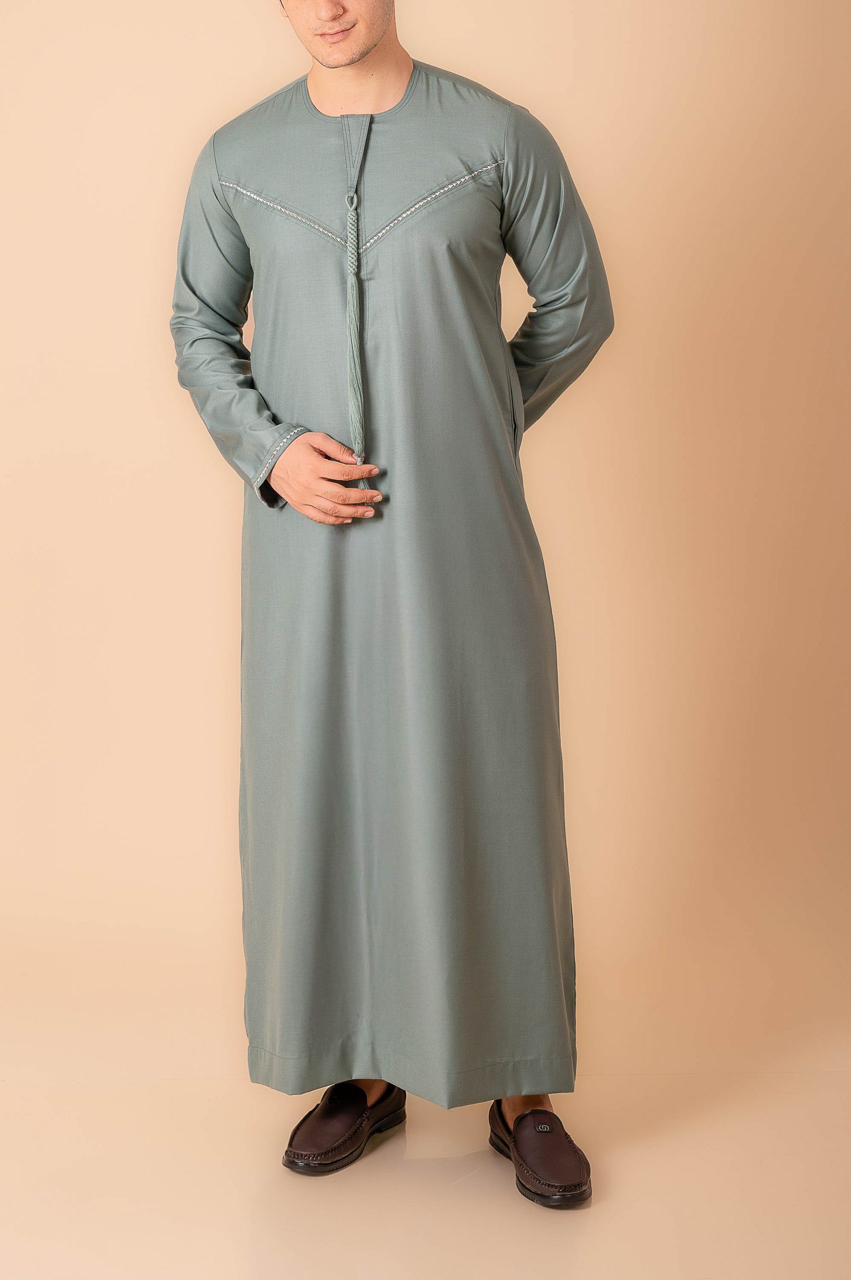 A premium sage green Emirati thobe highlighted with refined silver braided detailing and a classic front tassel.