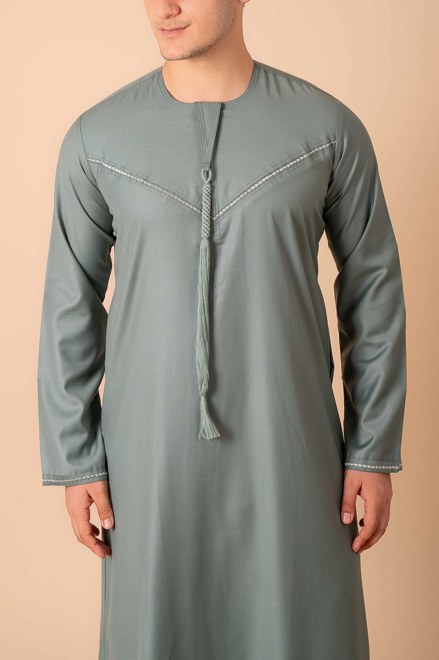 Premium Sage Green Emirati Tassel Thobe for Men with Silver Braided V-Panel – Modern Kandura Style