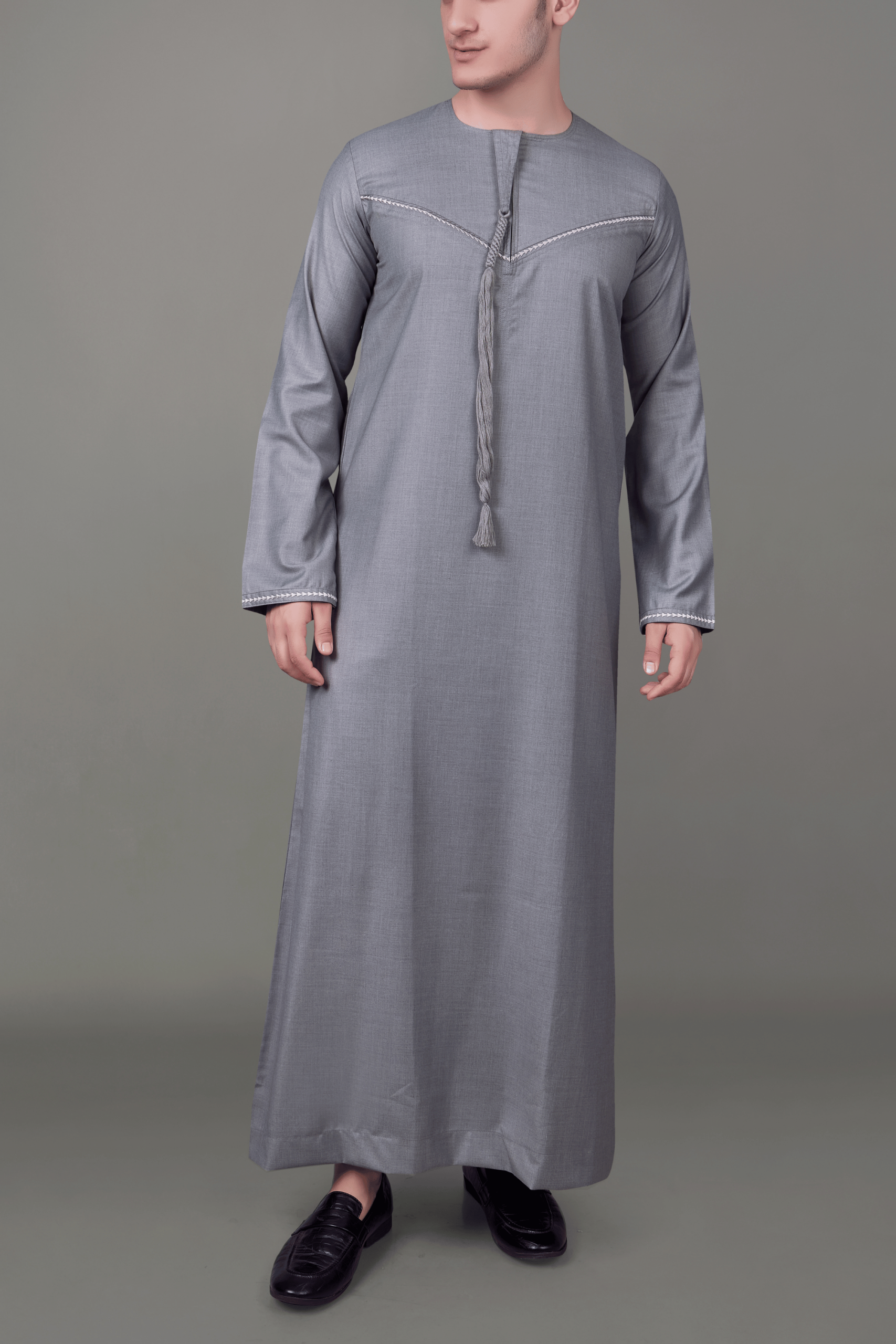 A refined steel grey Emirati thobe featuring elegant tassel and subtle silver chest embroidery.