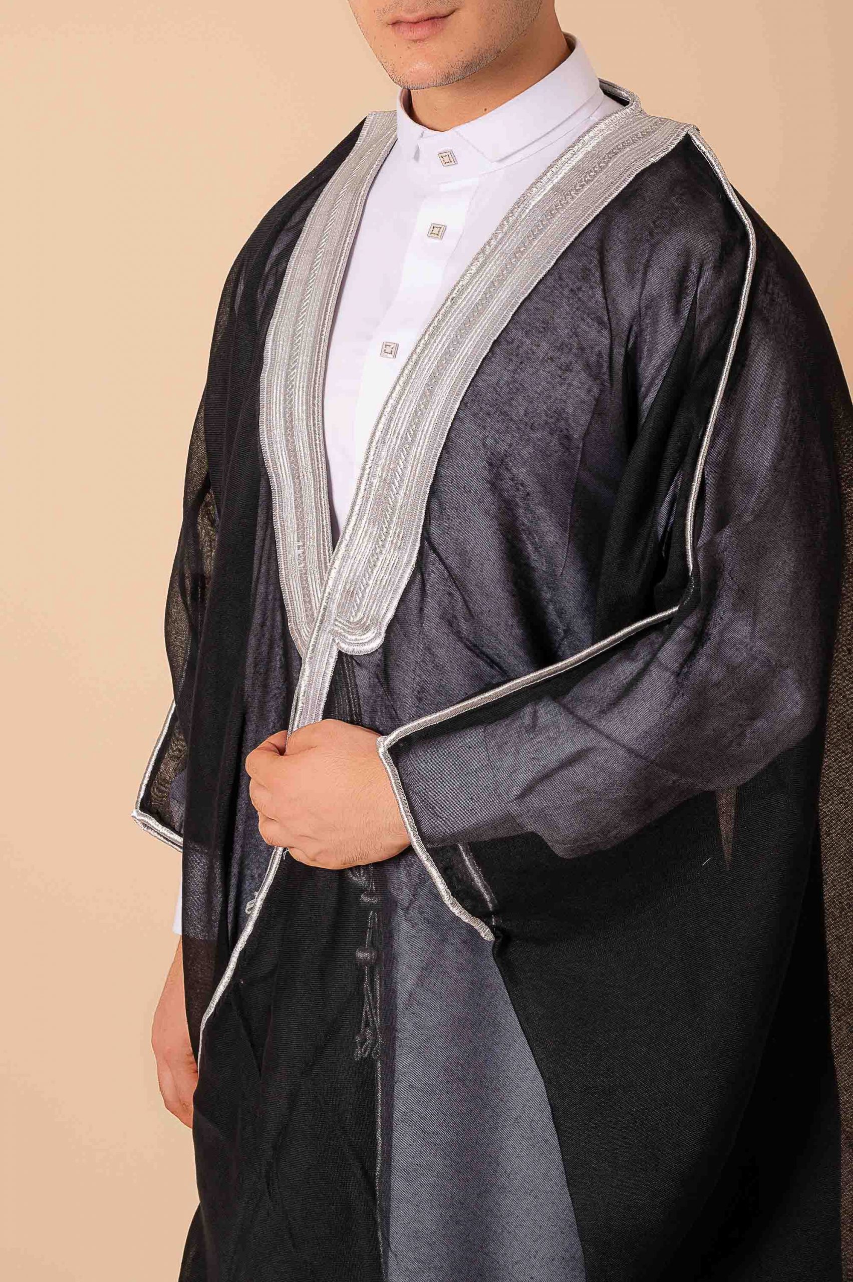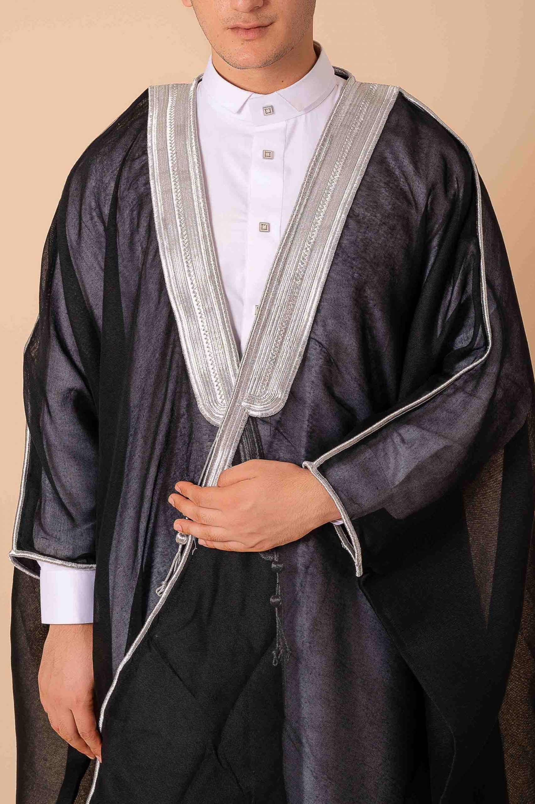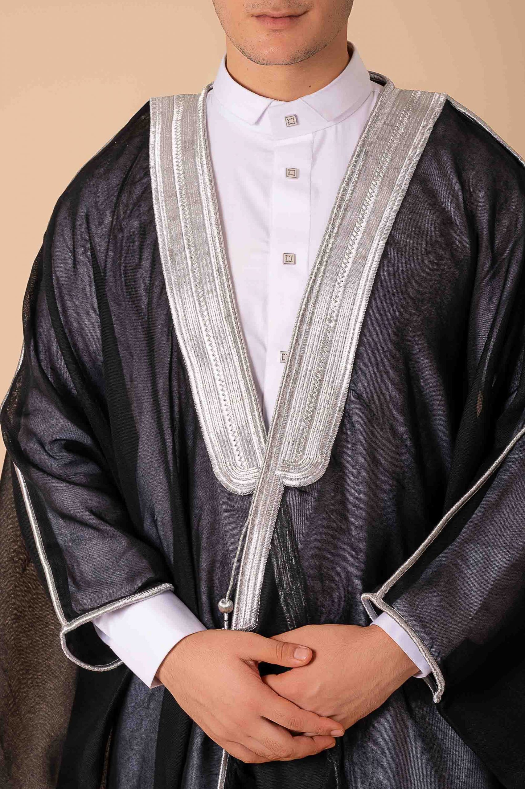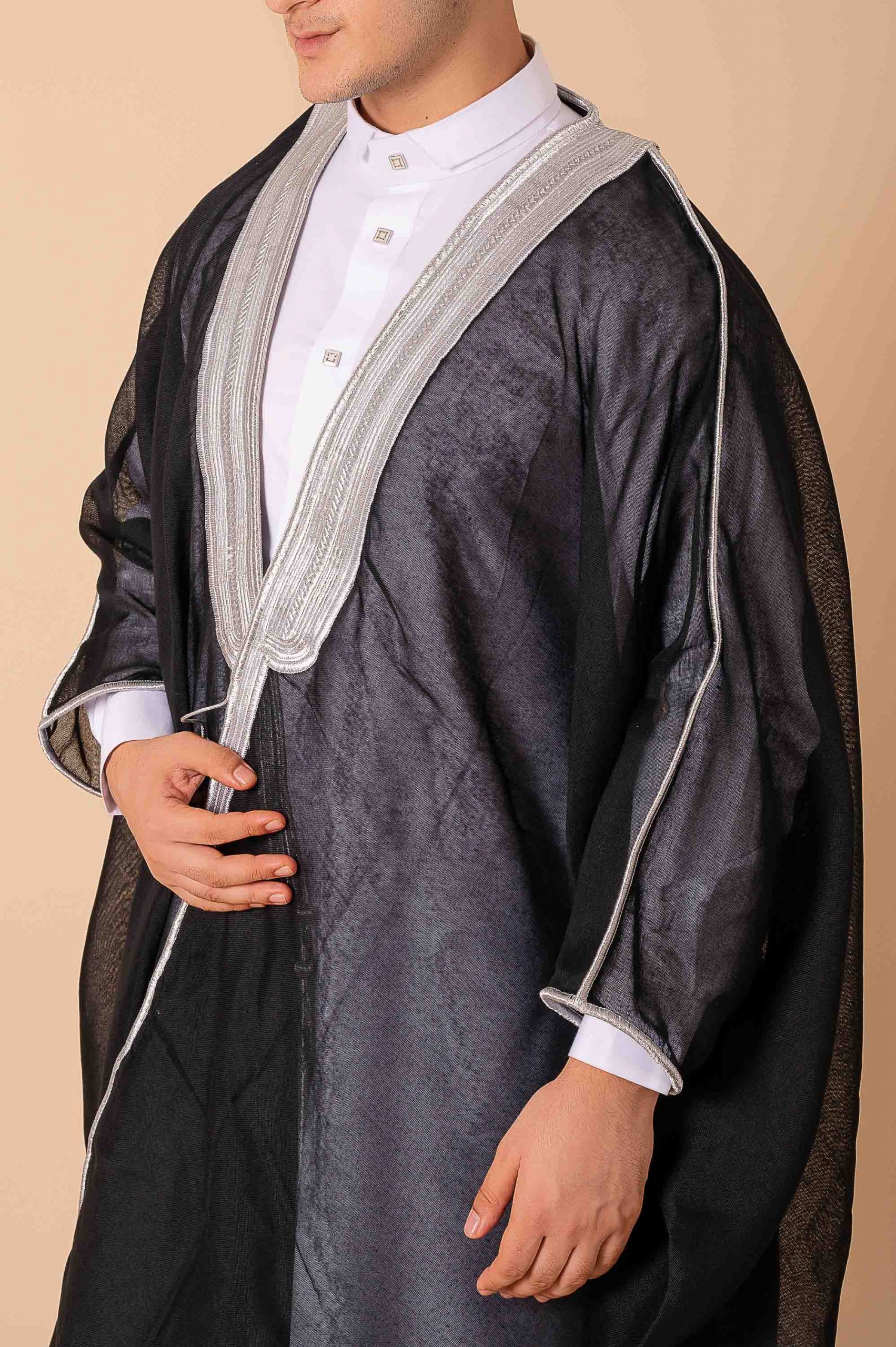 A royal black Arabic bisht highlighted with intricate silver zari border embroidery for refined and prestigious occasions.