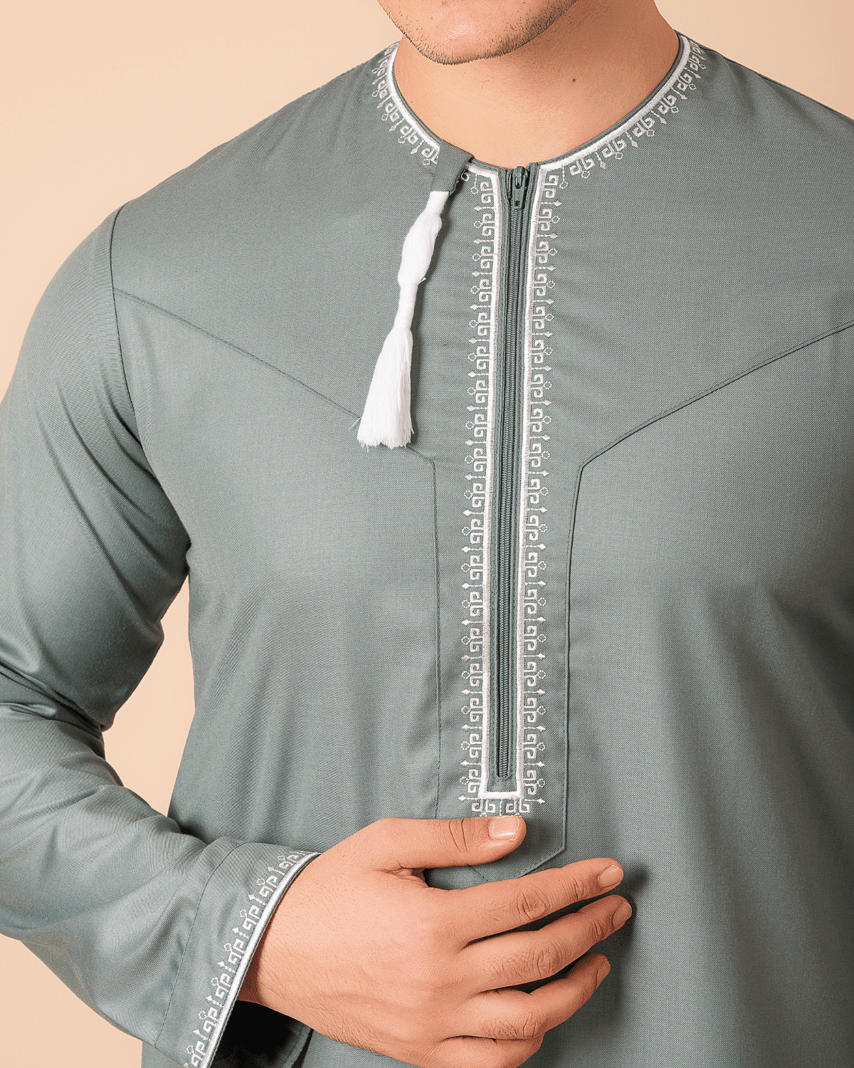 Elegant sage green Omani thobe featuring subtle geometric embroidery and classic tassel detailing.
