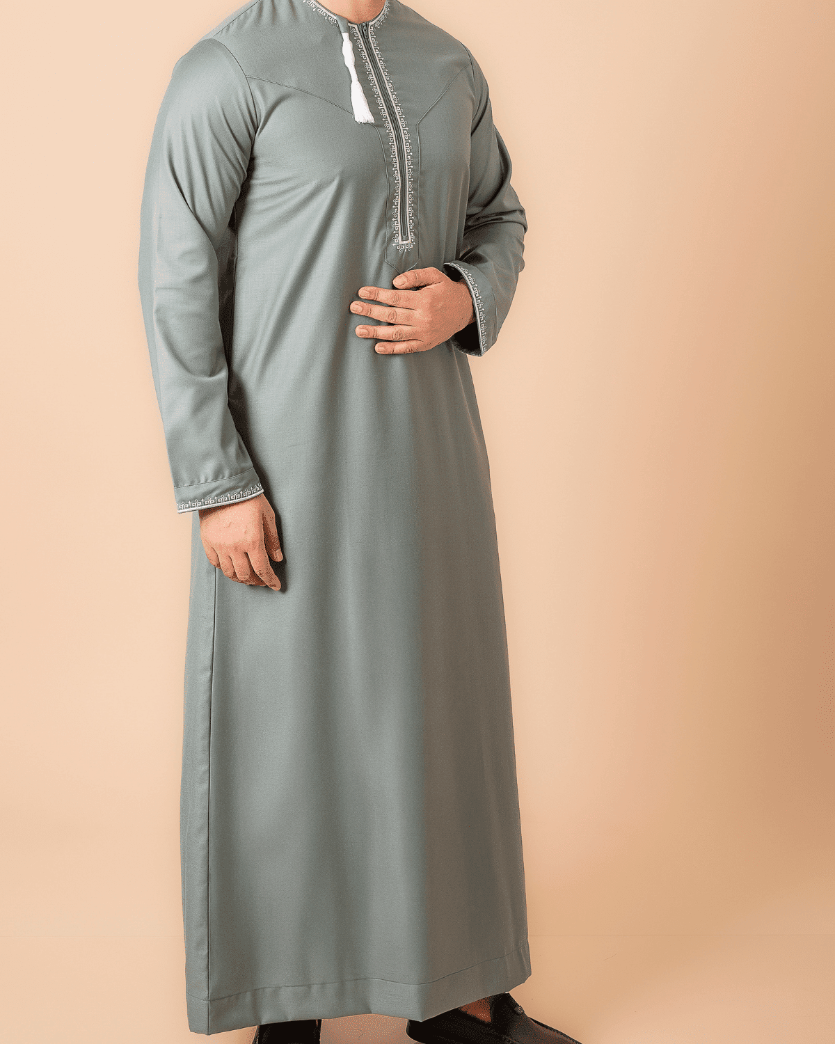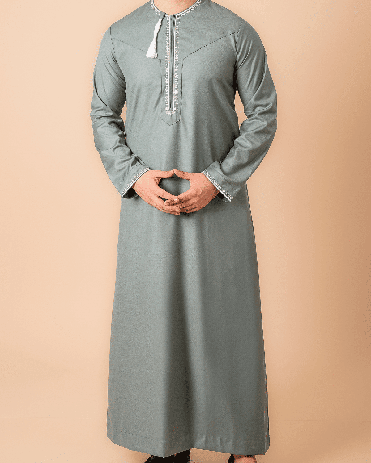 This refined sage green Omani thobe is accented with traditional beige geometric embroidery along the placket and cuffs for a timeless Gulf look. Finished with a signature Omani tassel and modest full-length fit, it is ideal for prayers, Eid, and formal occasions.