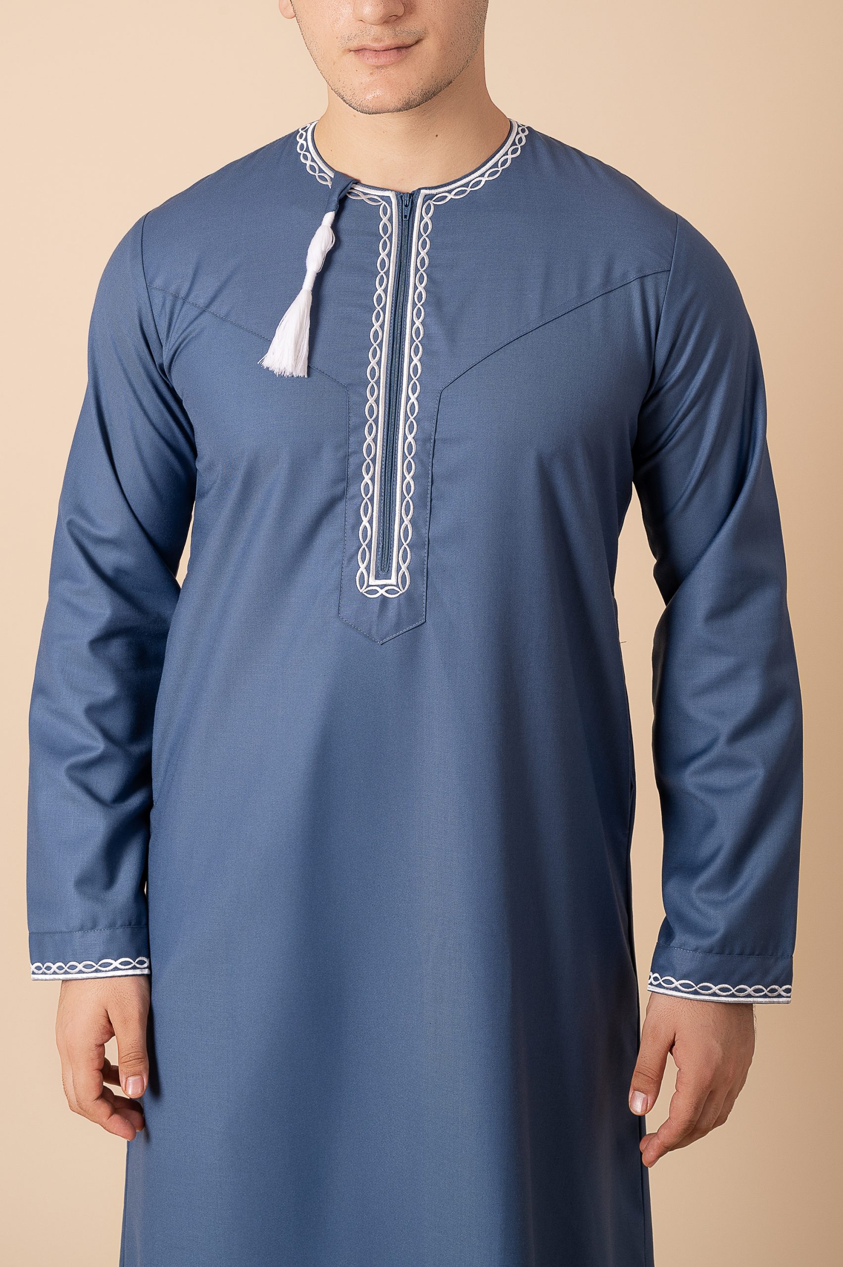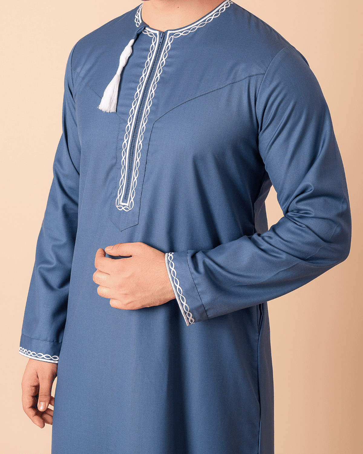 This steel blue Omani thobe features elegant white loop embroidery along the placket, neckline, and cuffs for a clean traditional finish.